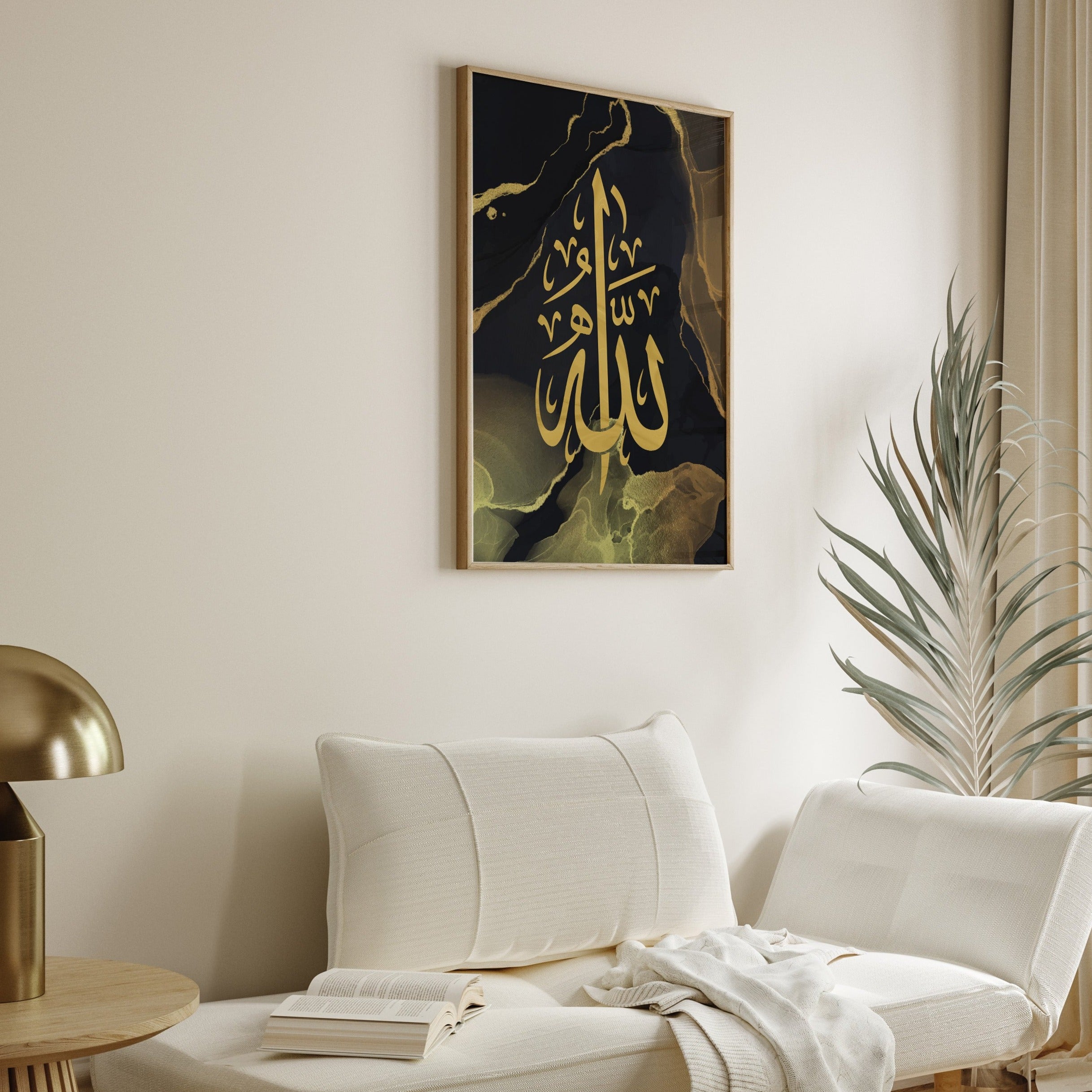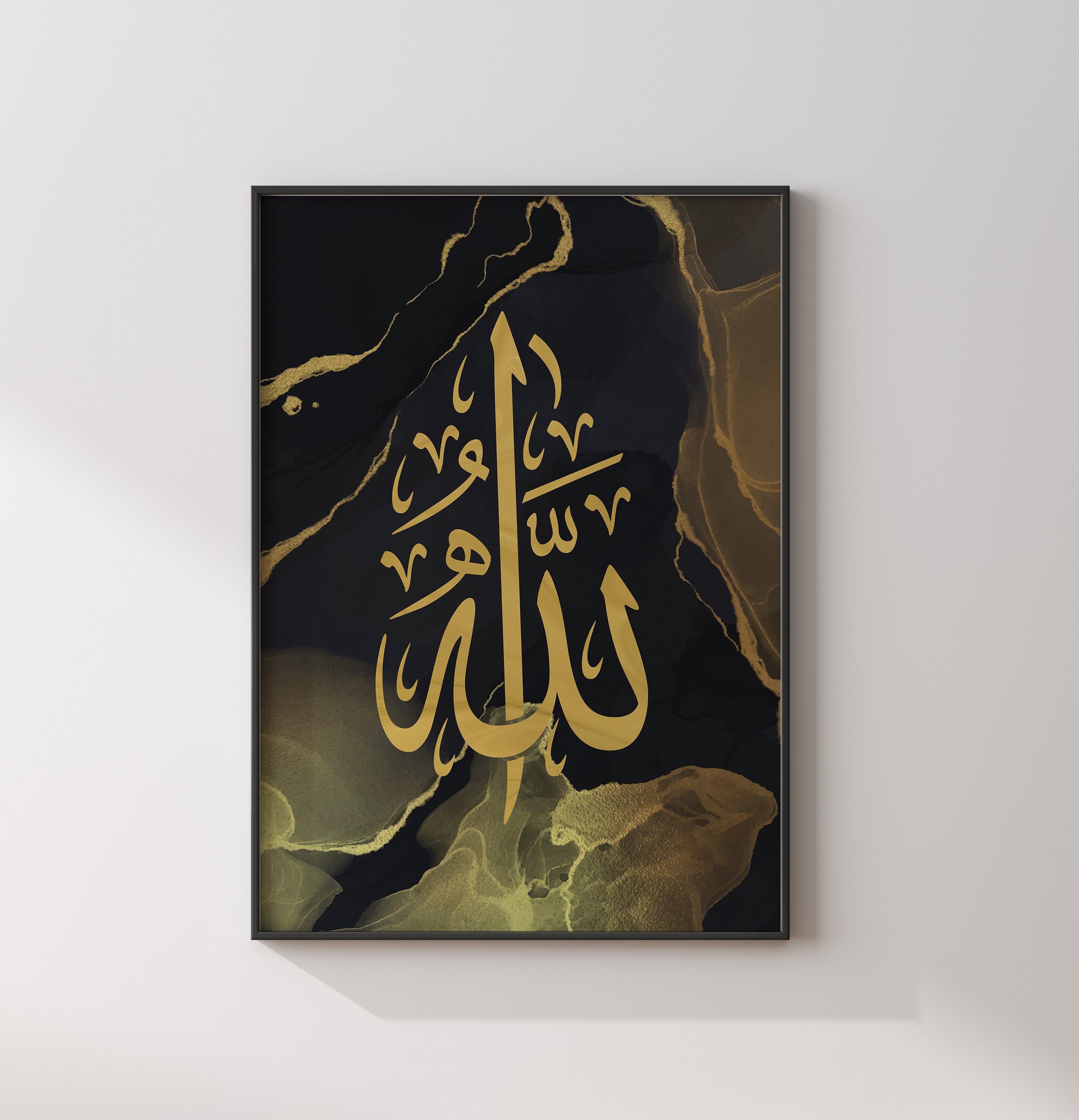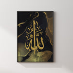 Black & Gold Allah Arabic Calligraphy Modern Islamic Wall Art Print With Alcohol Ink Elements