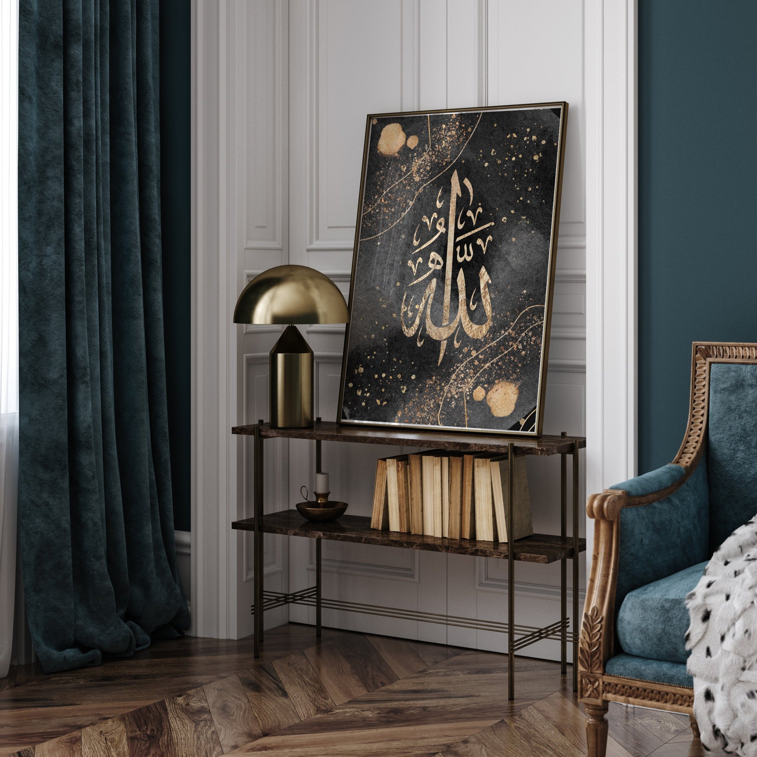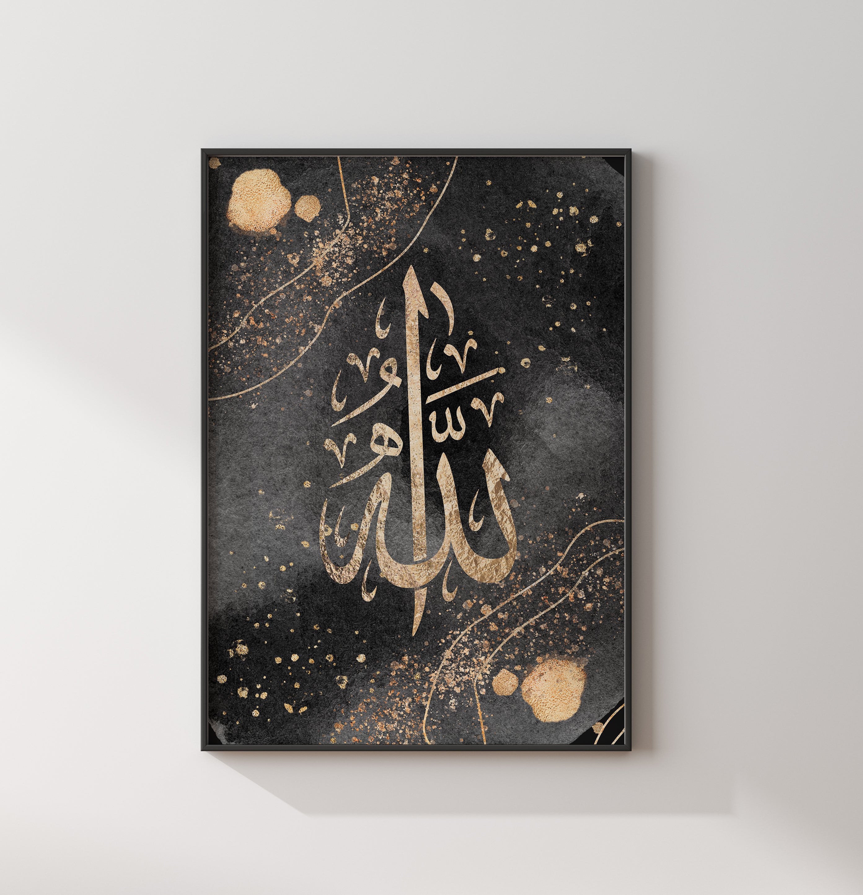 Black & Gold Allah Arabic Calligraphy Modern Islamic Wall Art Print With Watercolour Elements