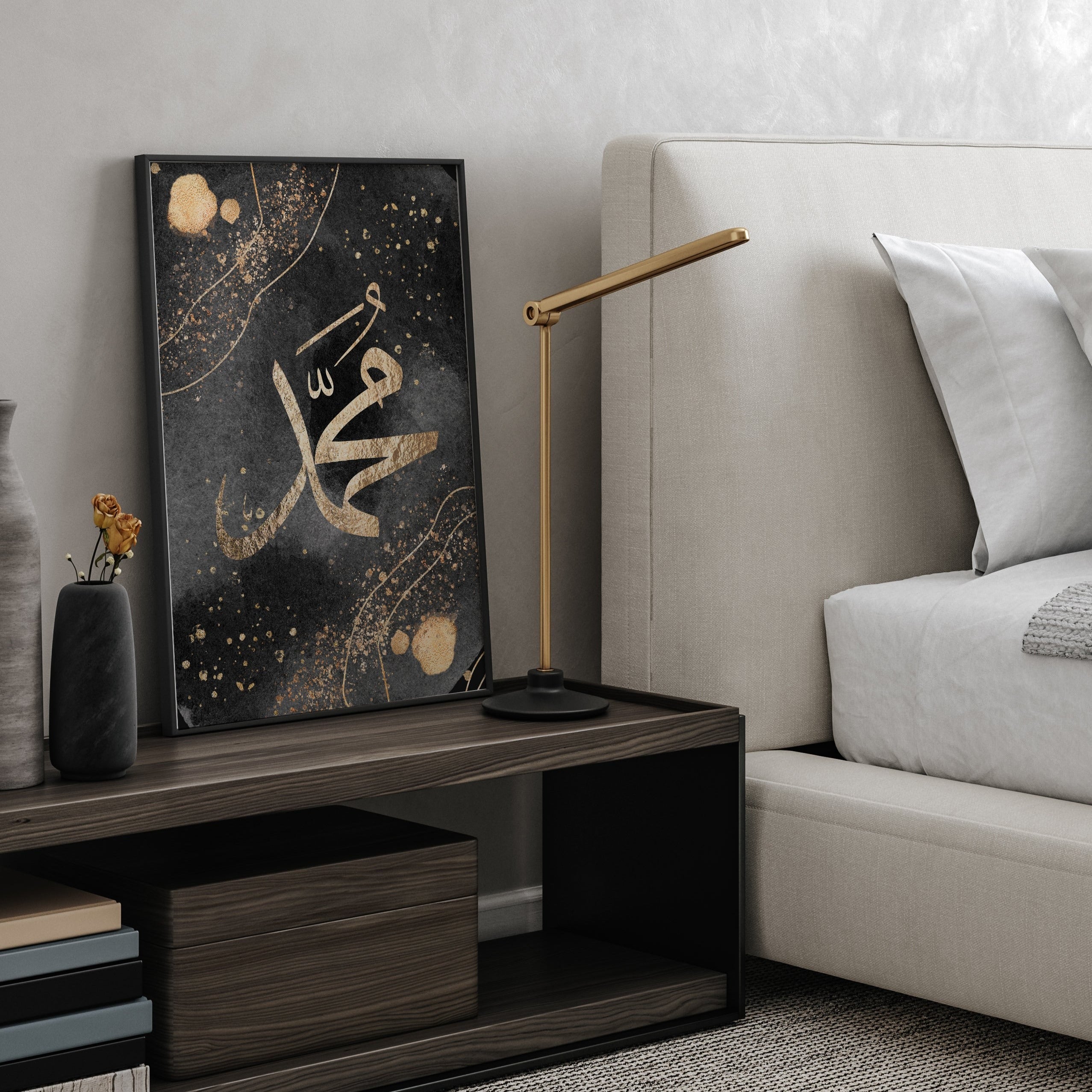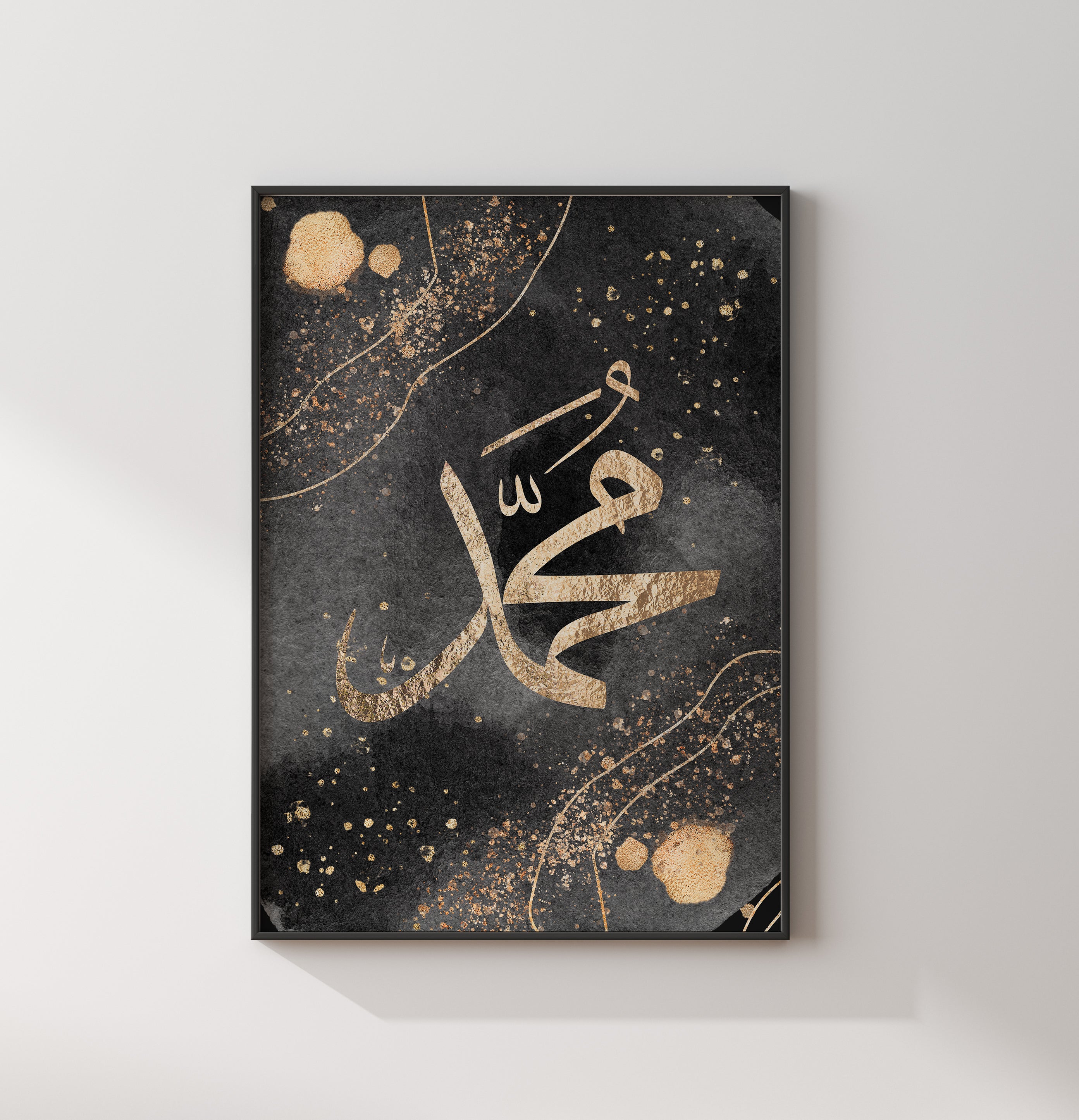 Black & Gold Prophet Muhammad Arabic Calligraphy Modern Islamic Wall Art Print With Watercolour Elements