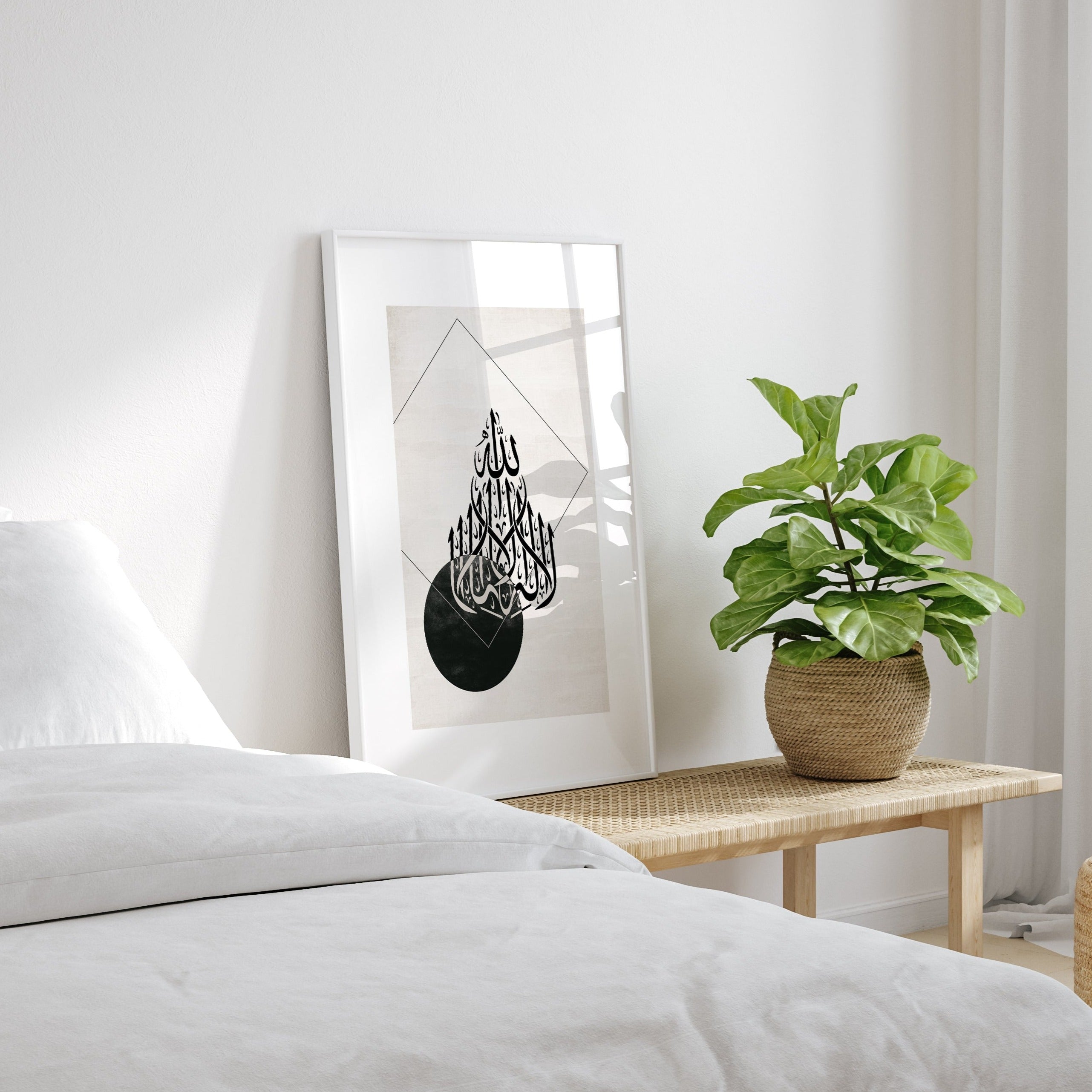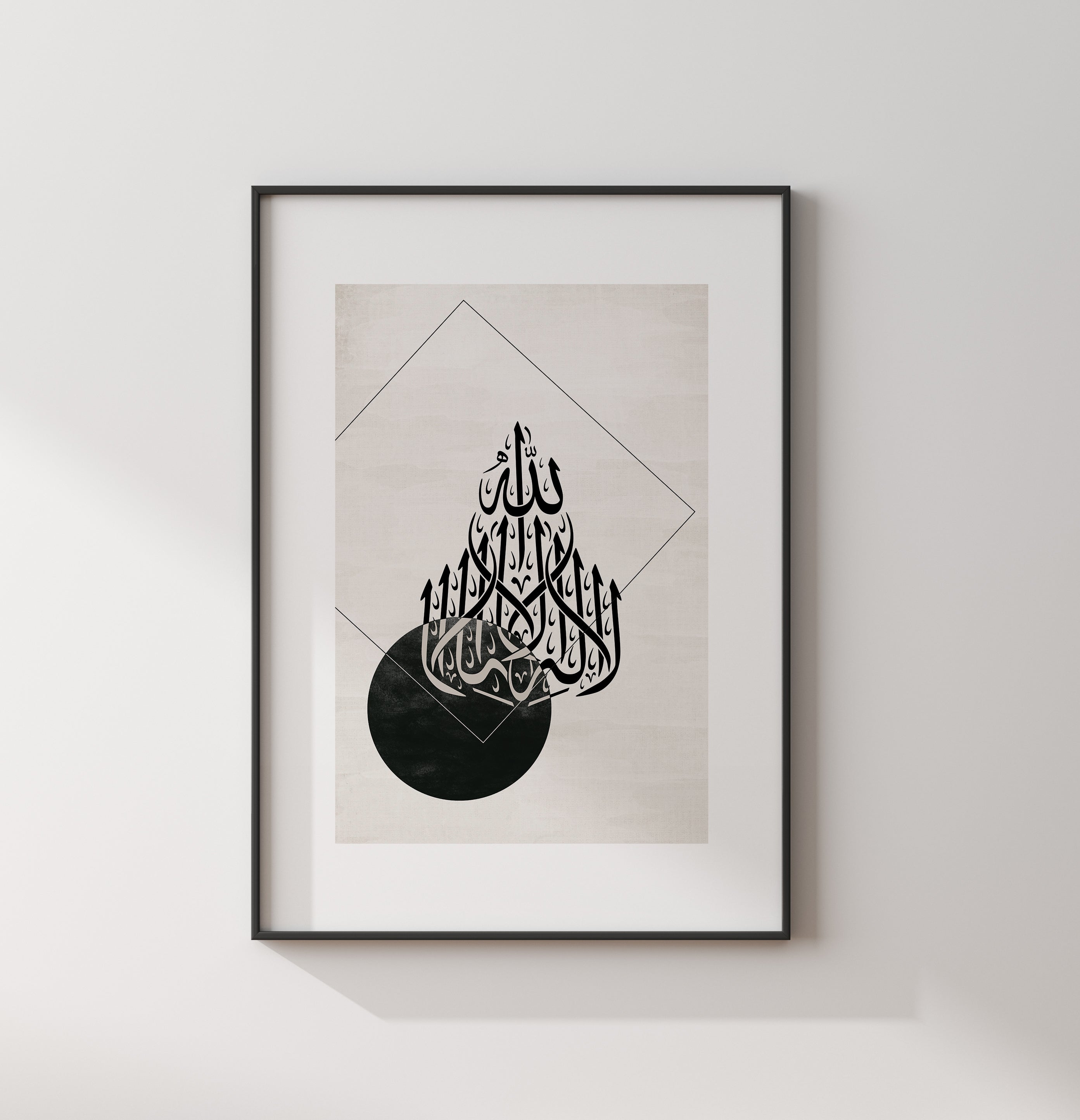 Black & Grey Vintage Kalimah Modern Abstract Islamic Wall Art Print With White Border