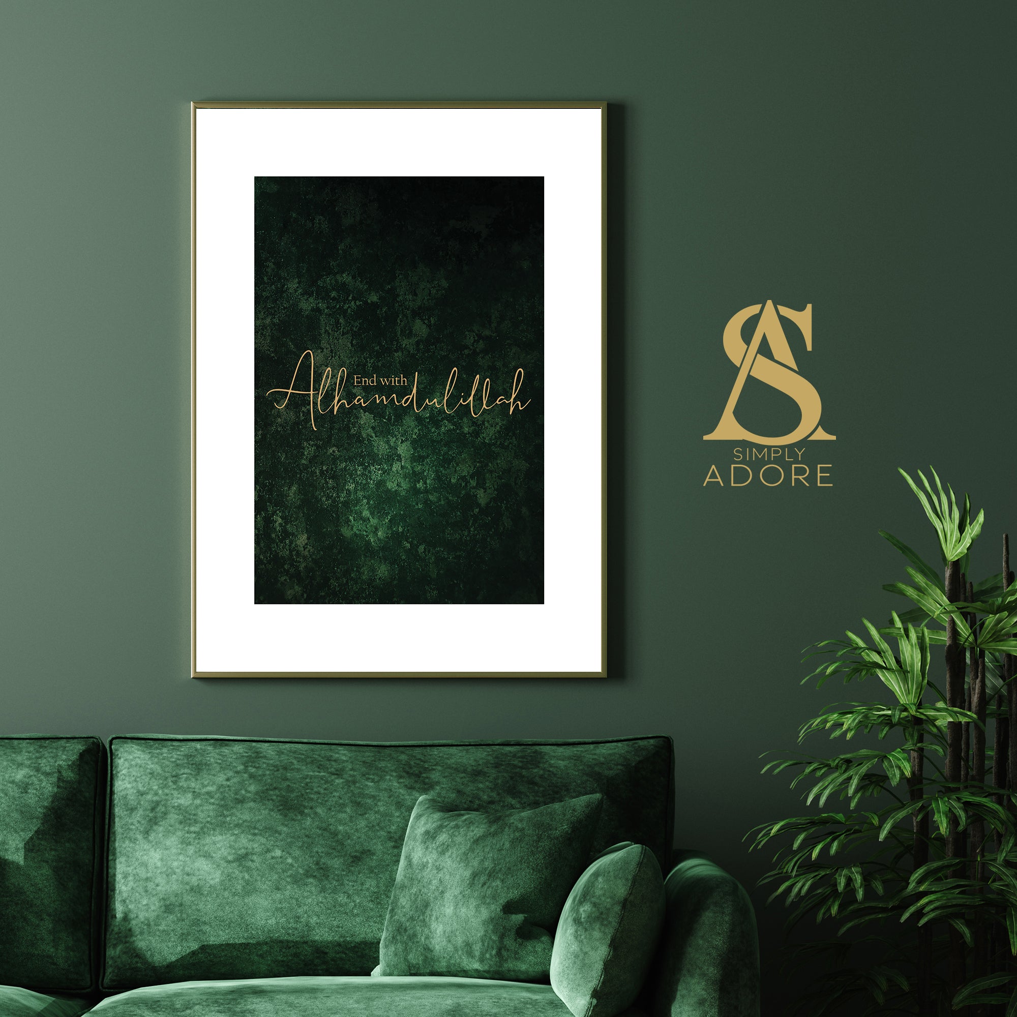 End With Alhamdulillah Emerald Green And Gold With White Border Abstract Arabic Calligraphy Islamic WallArt Print Prints Gift