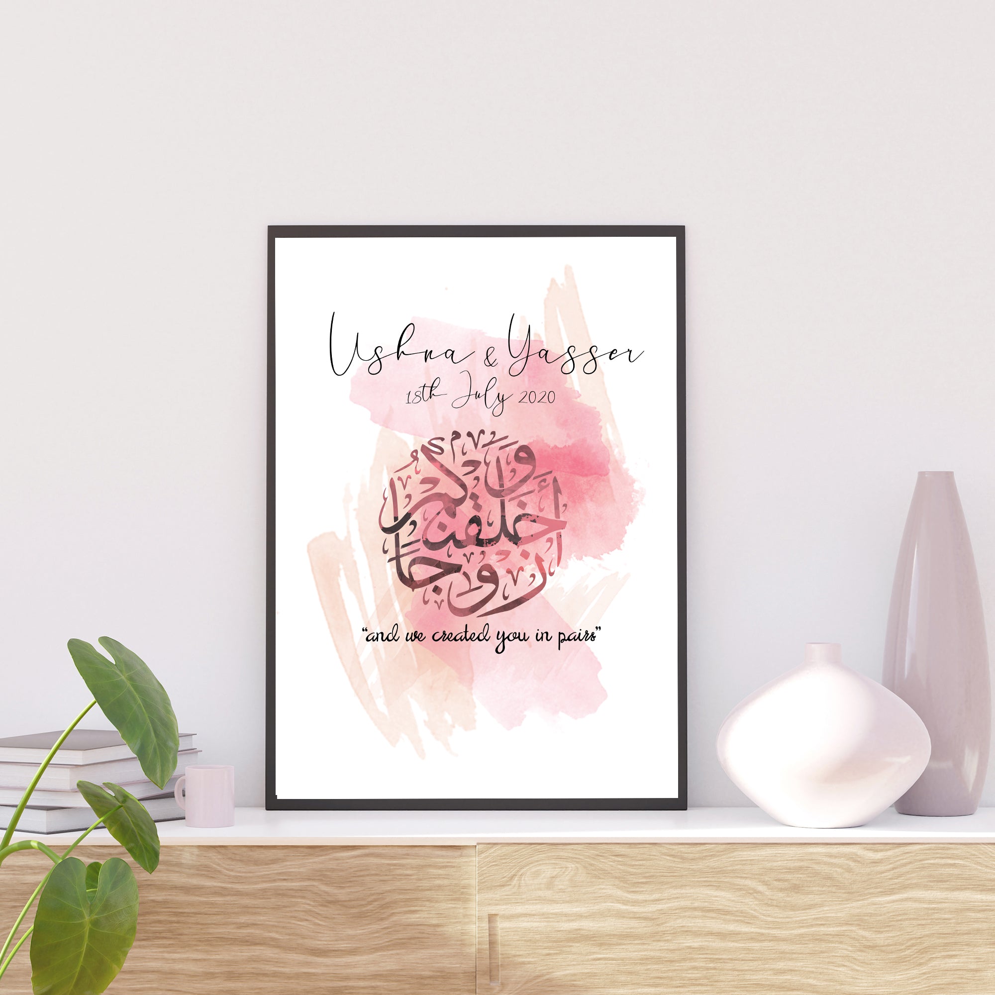 Personalised Pink Watercolour Nikah Wedding Couple Gift Islamic Wall Art Print