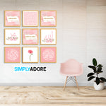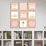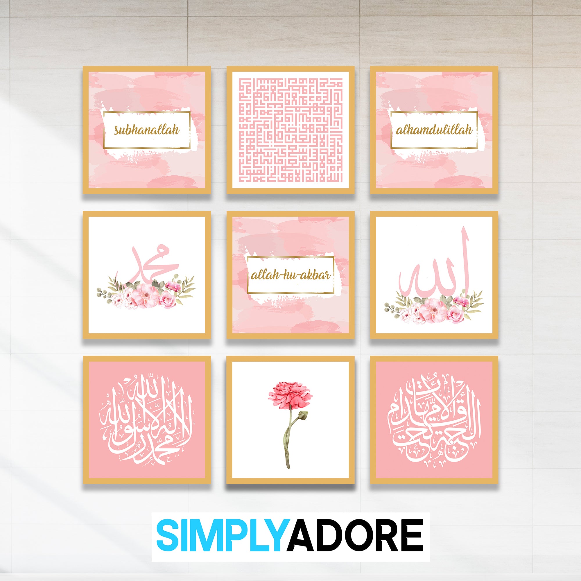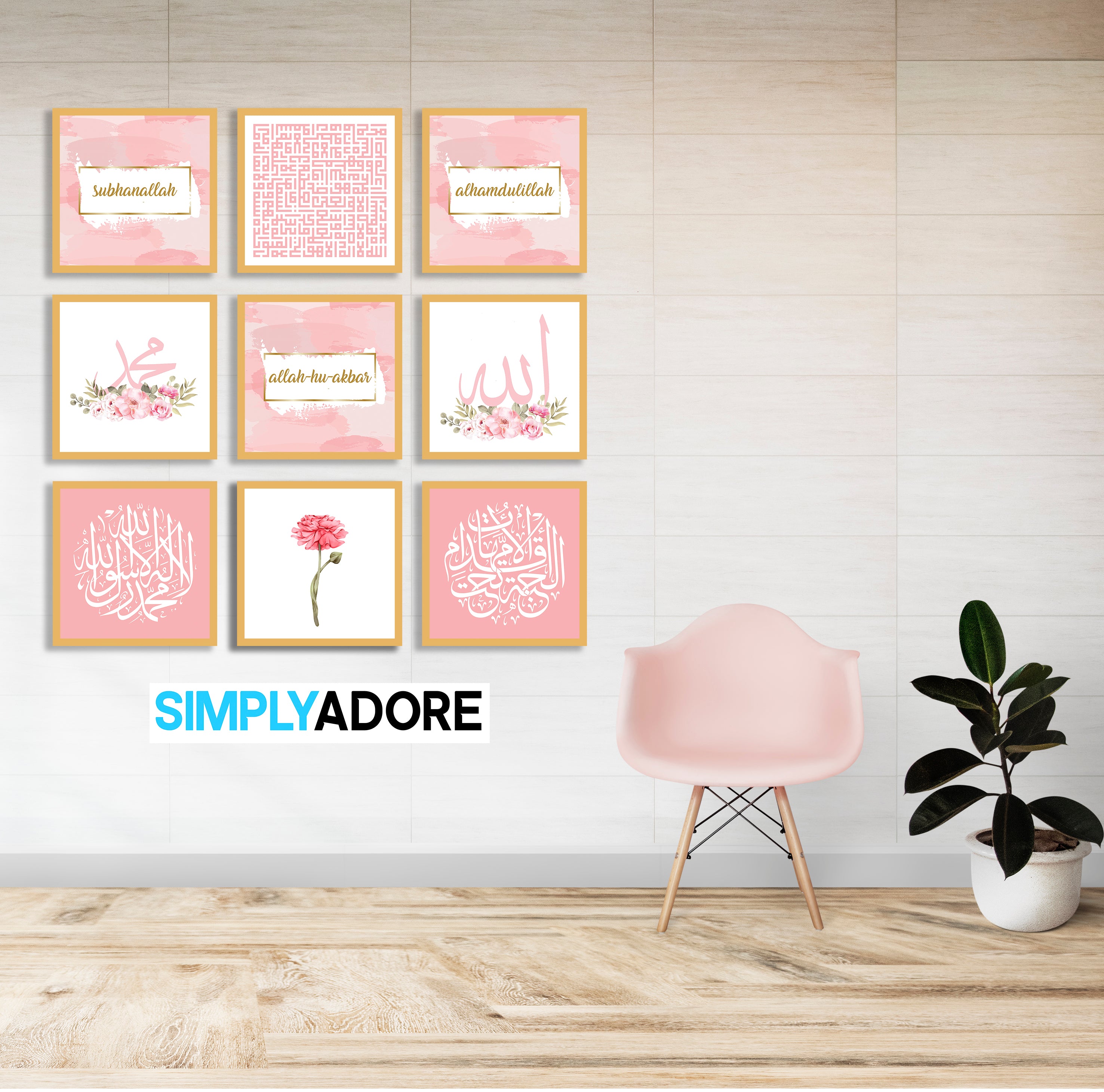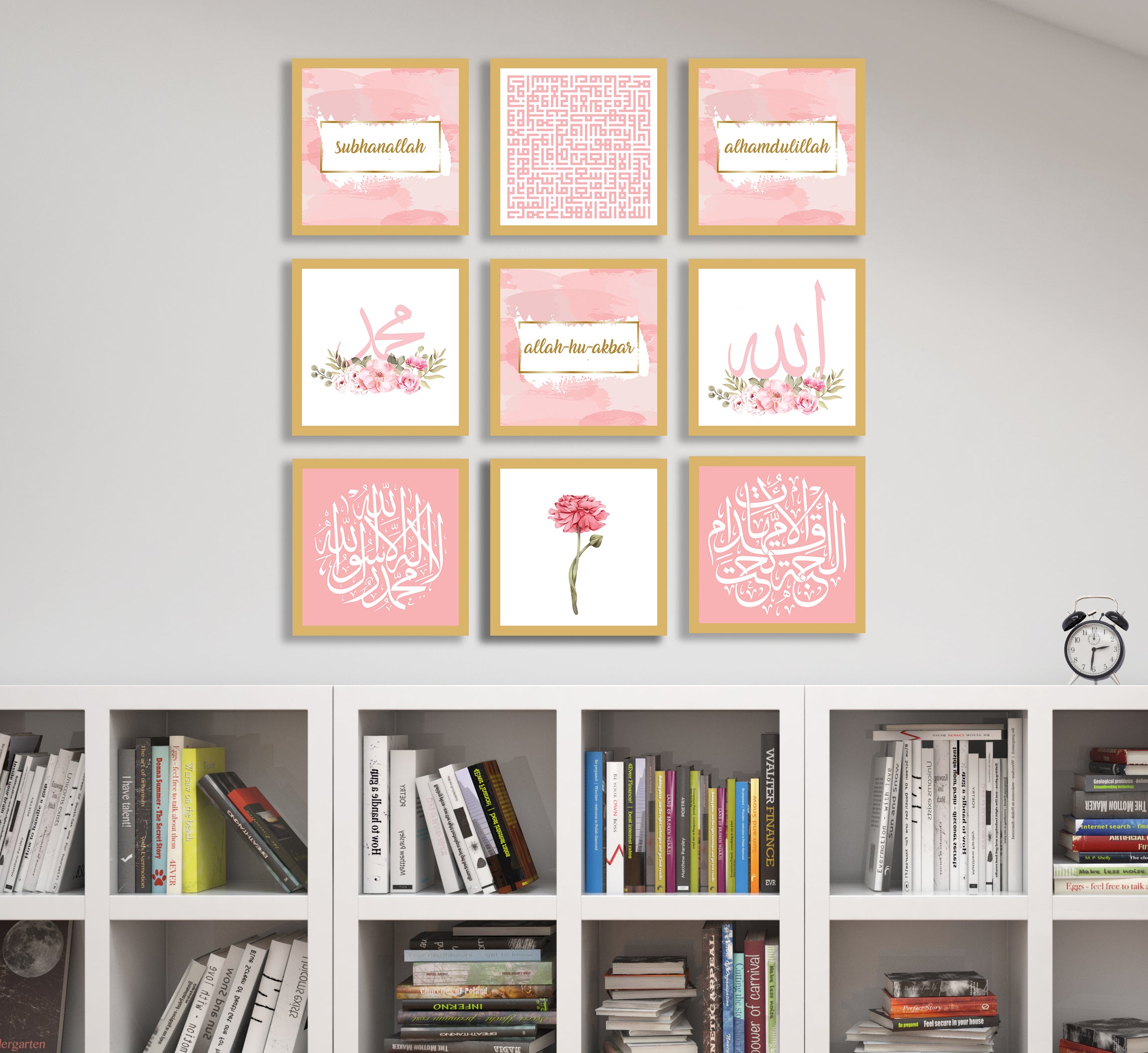 Set of 9 Pink Gallery Tasbeeh & Arabic Calligraphy Islamic Wall Art Prints