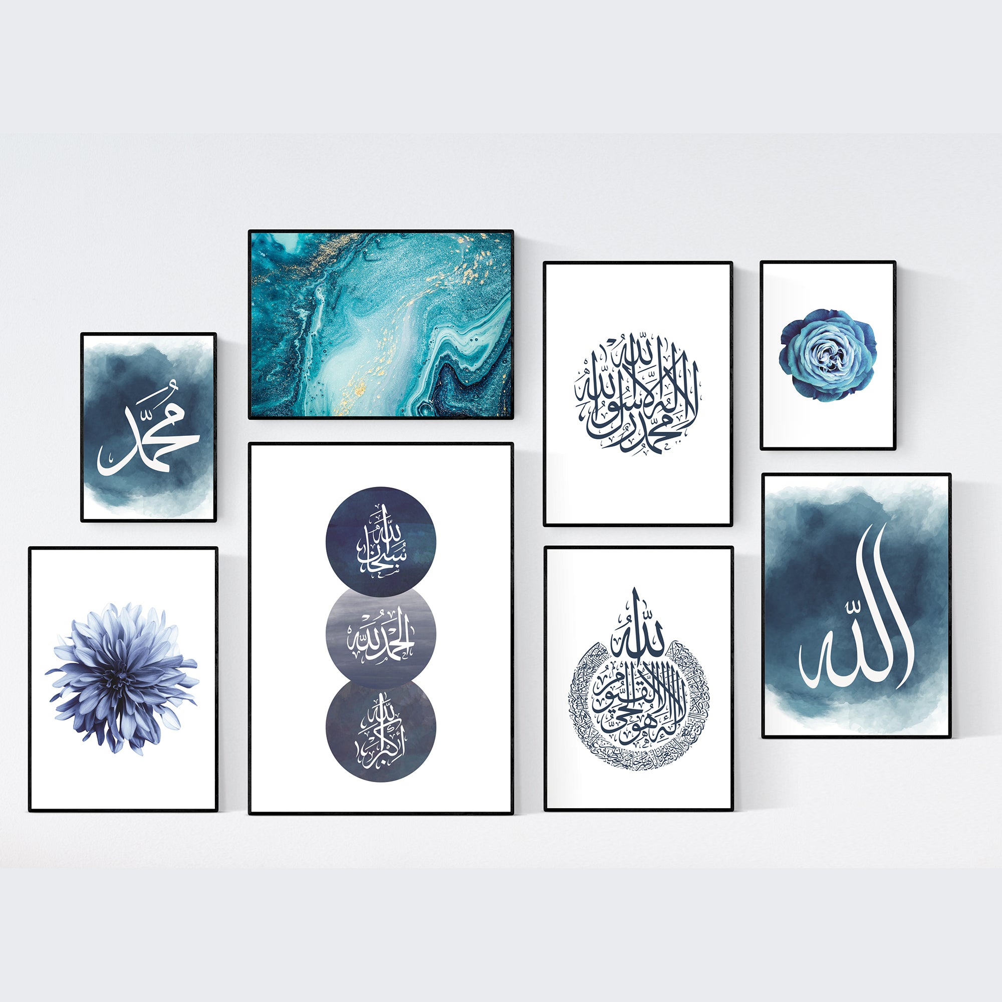 The Blue Ocean Gallery Collection - Set of 8 Allah Muhammad Tasbeeh Ayatul Kursi Arabic Calligraphy Islamic Wall Art Print