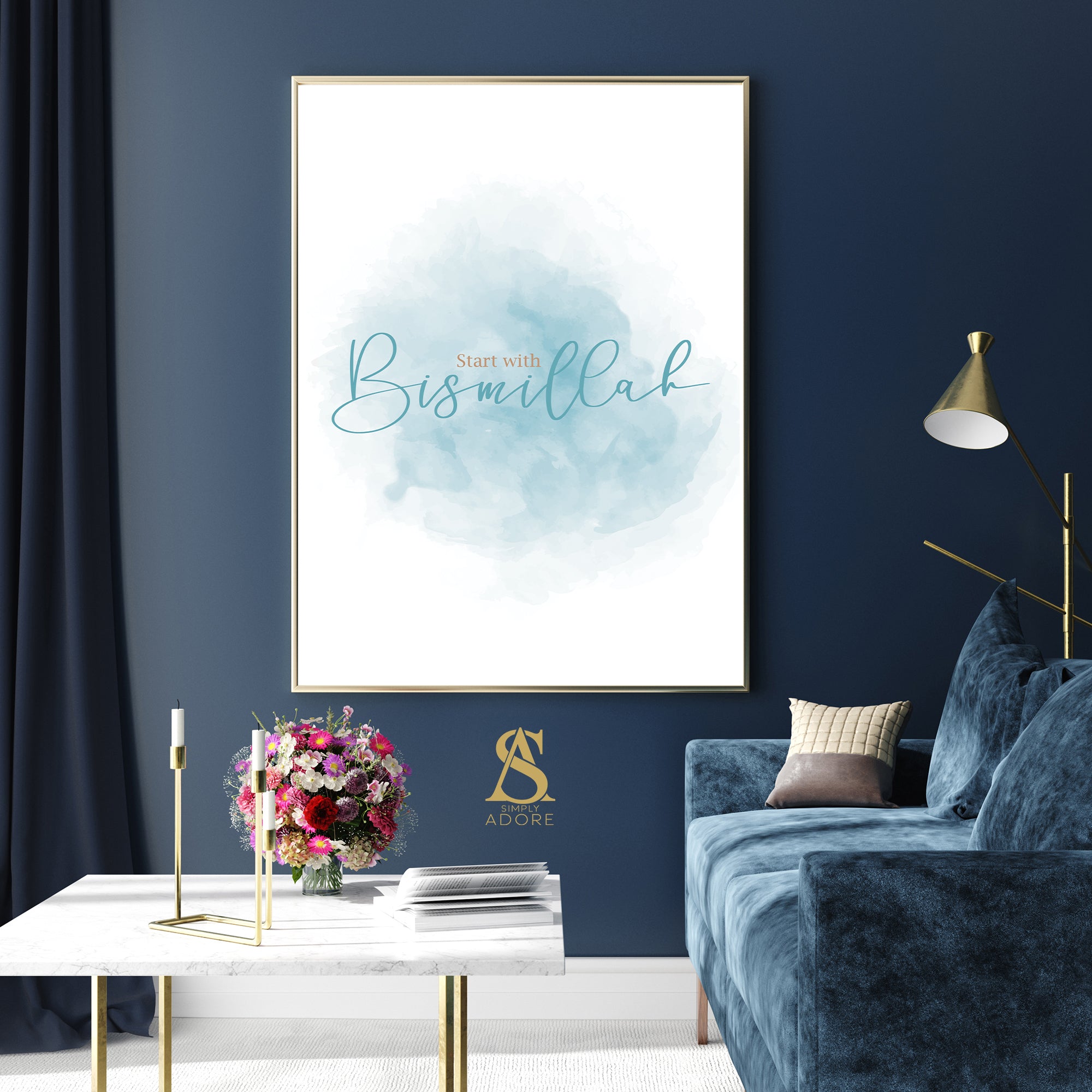 Blue & Gold Watercolour Start With Bismillah Islamic Wall Art Print With Arabic Calligraphy Islamic Print