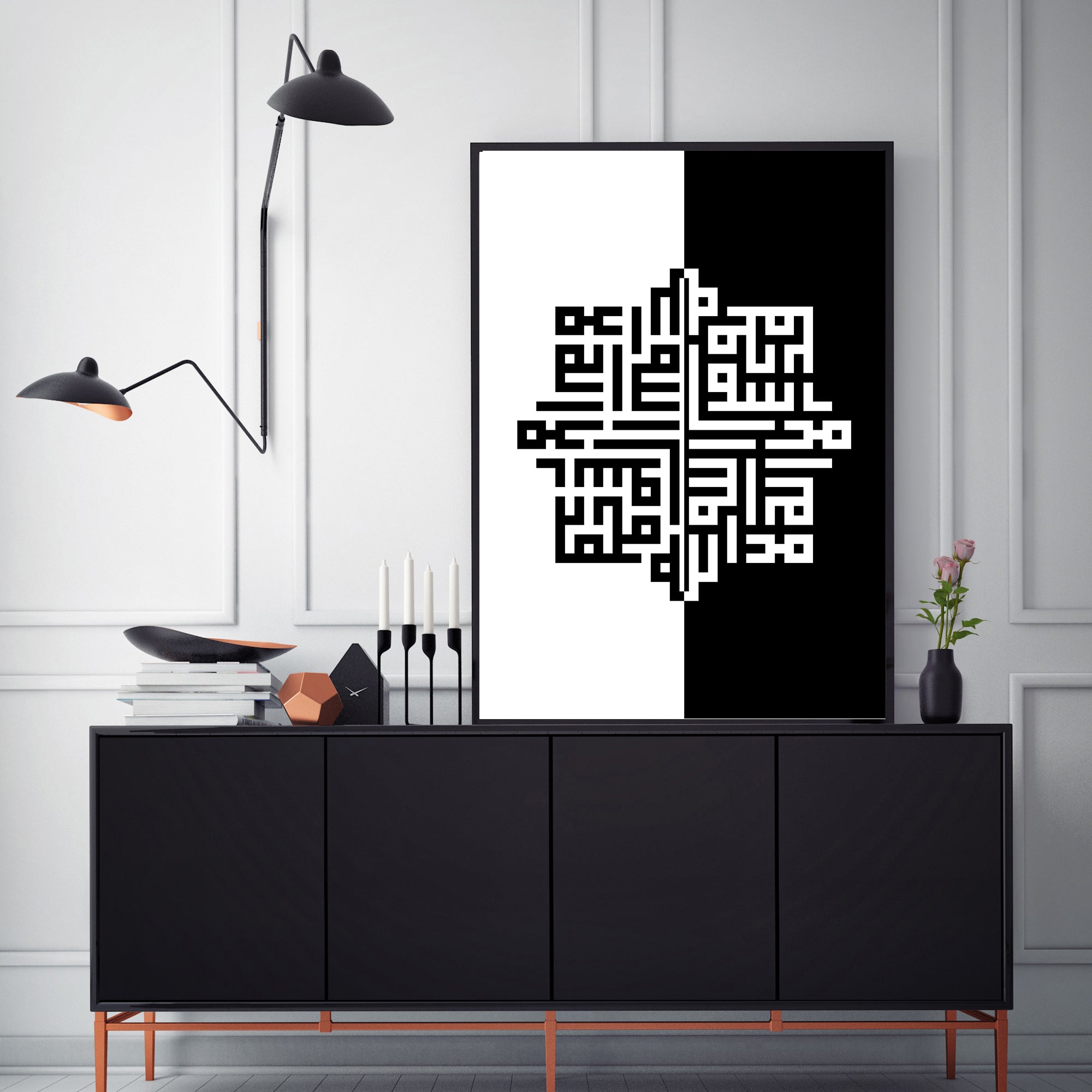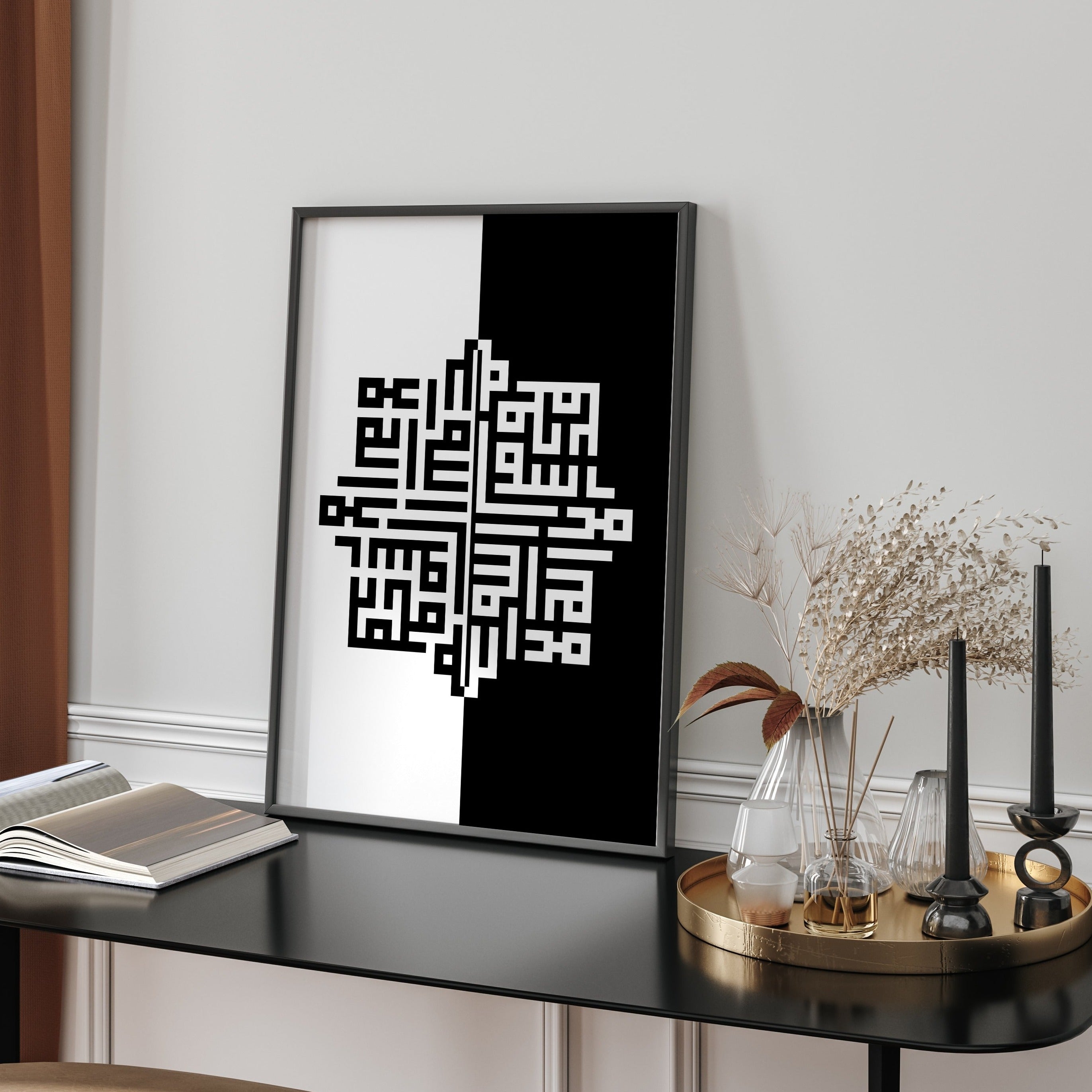 Monochrome Kalimah Arabic Kufic Calligraphy Modern Islamic Wall Art Print Black & White