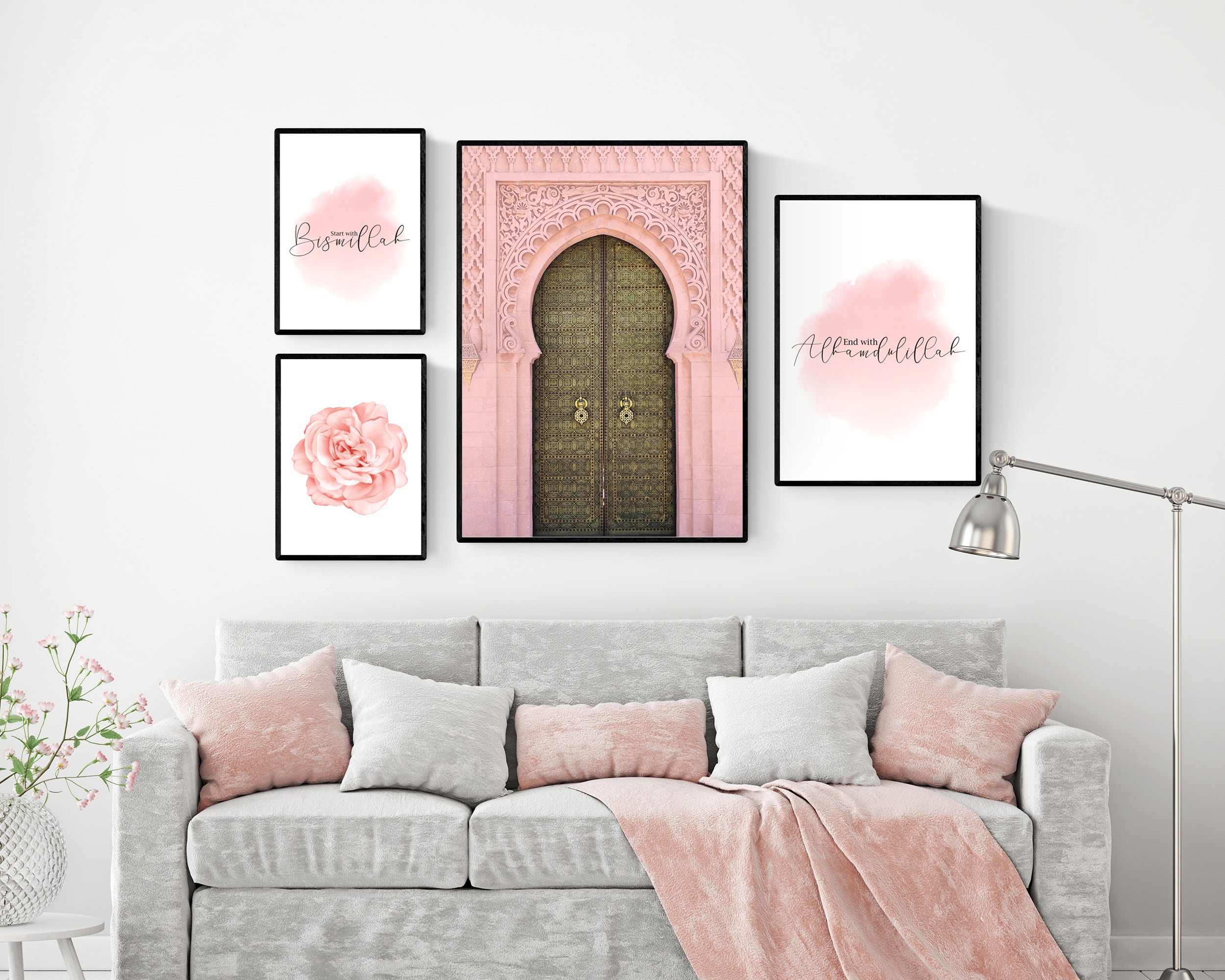 Pink Morocco Gallery Collection - Set of 4 Start With Bismillah End With Alhamdulillah Floral Islamic Wall Art Print Eid Gift Present