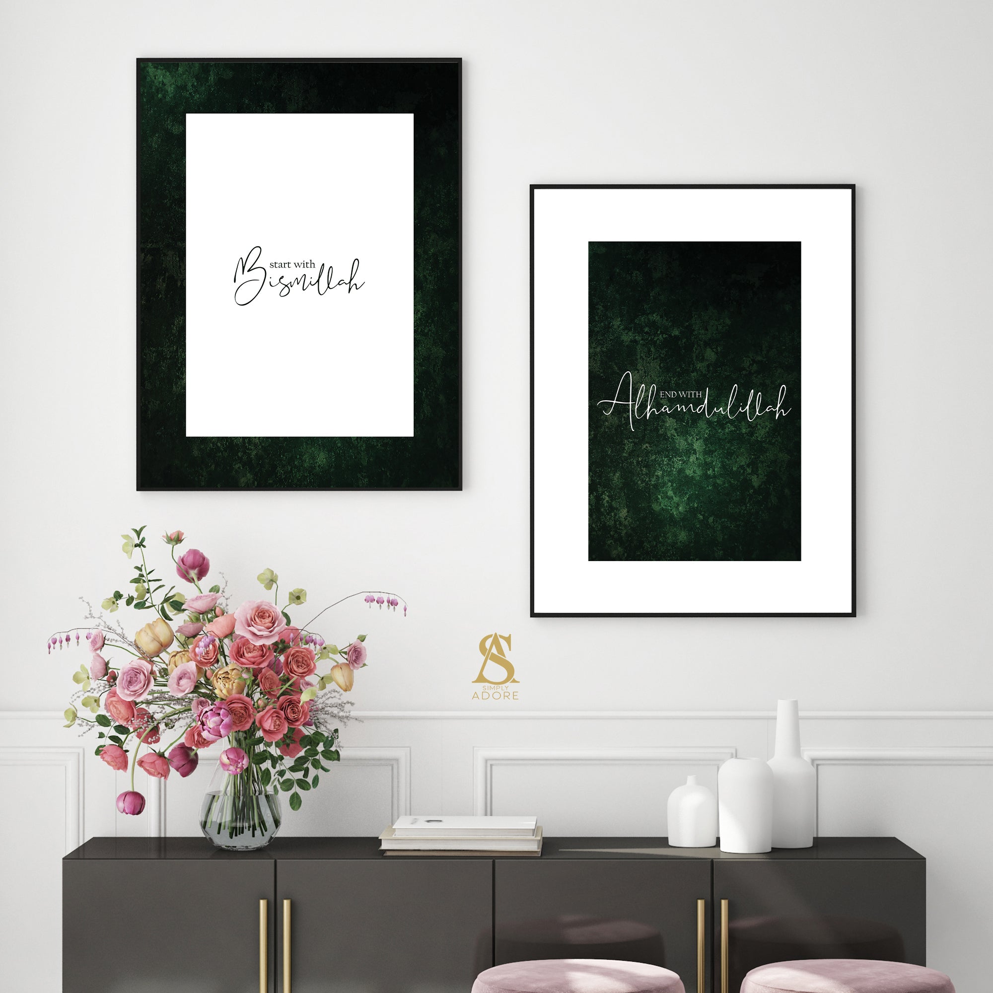 Set of 2 Start With Bismillah And End With Alhamdulillah Modern Minimalistic Abstract Emeral Green & White Wall Art Print