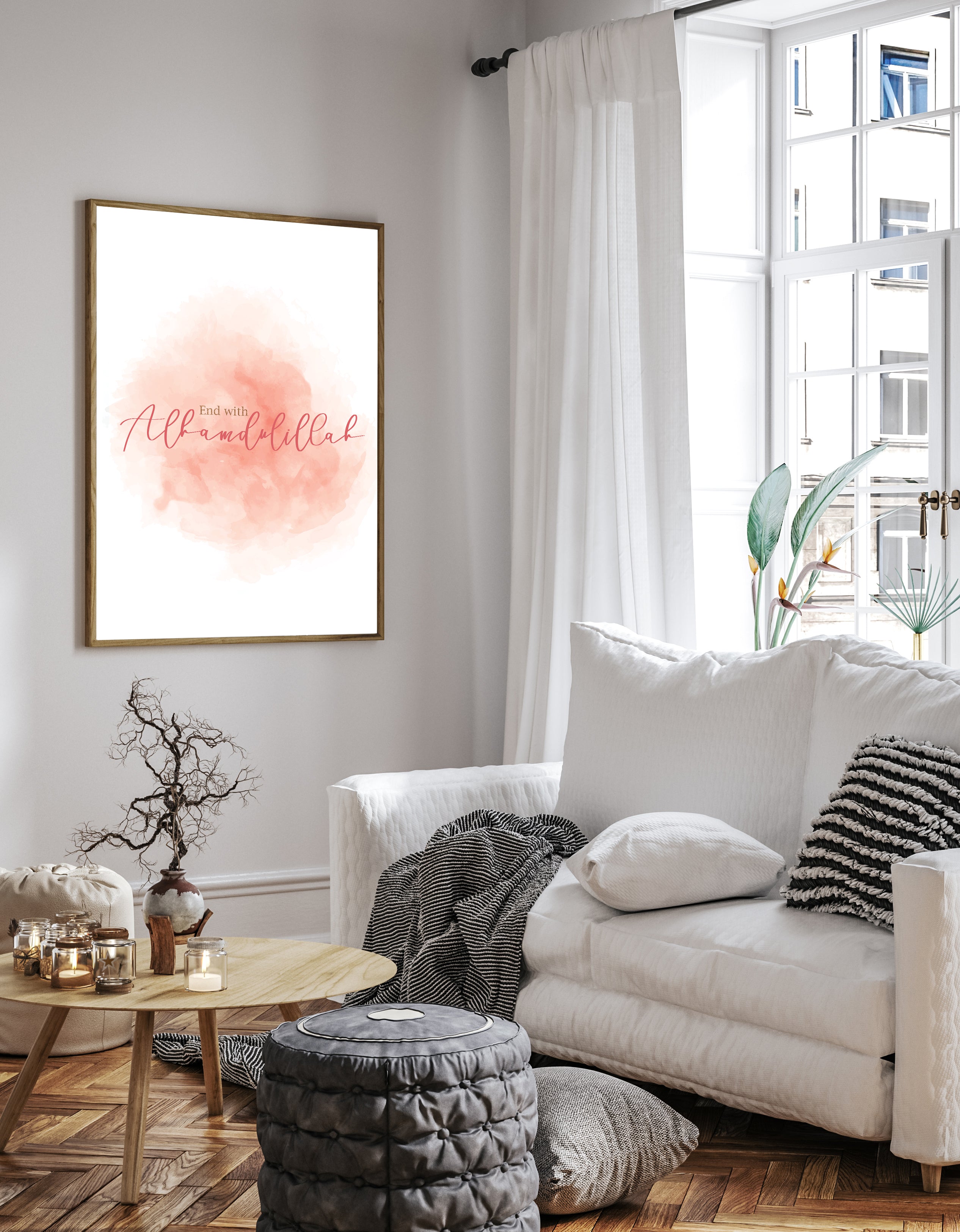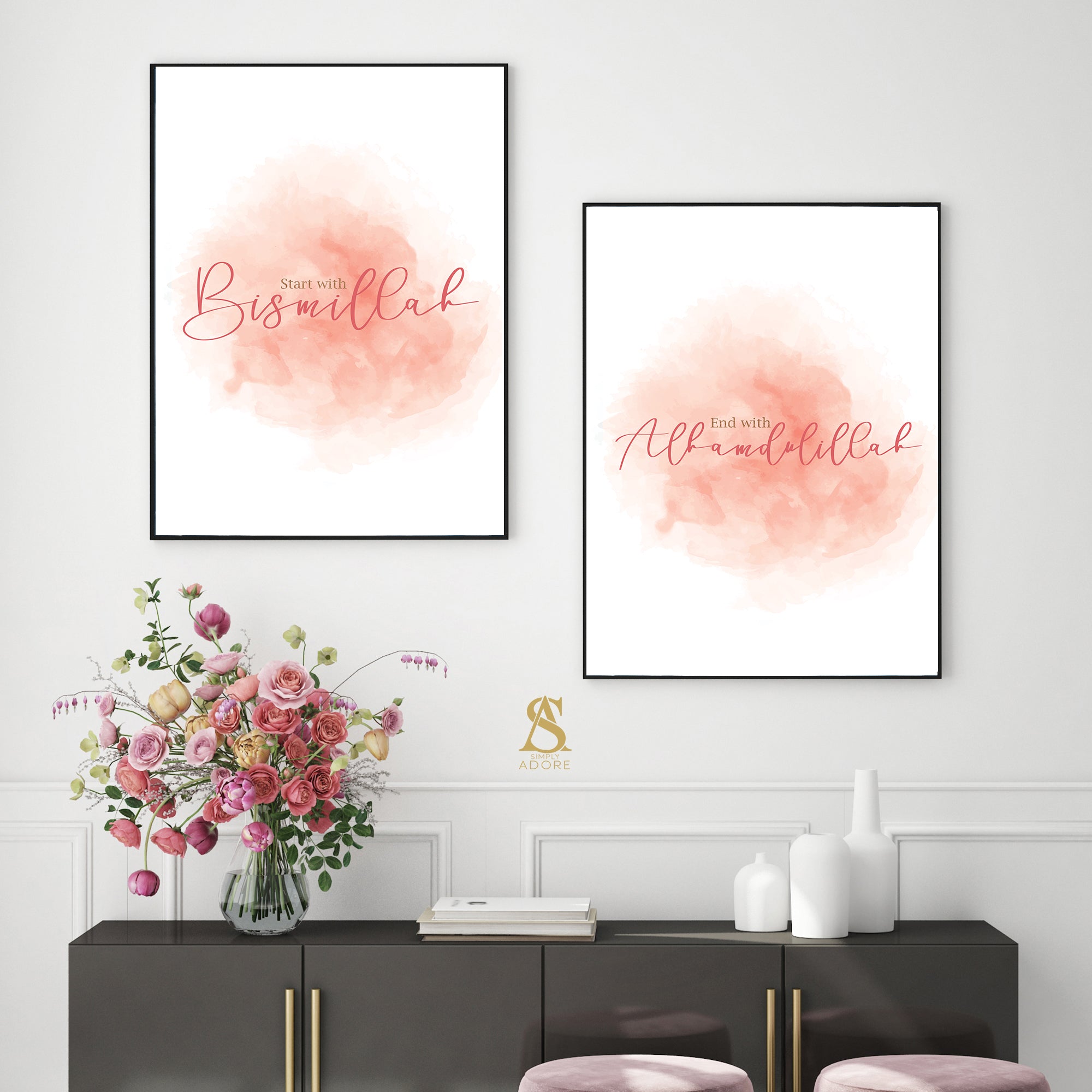 Set of 2 Start with Bismillah End WIth Alhamdulillah Pink Watercolour Islamic Abstract Arabic Calligraphy Wall Art Print 2022 New Home Gift