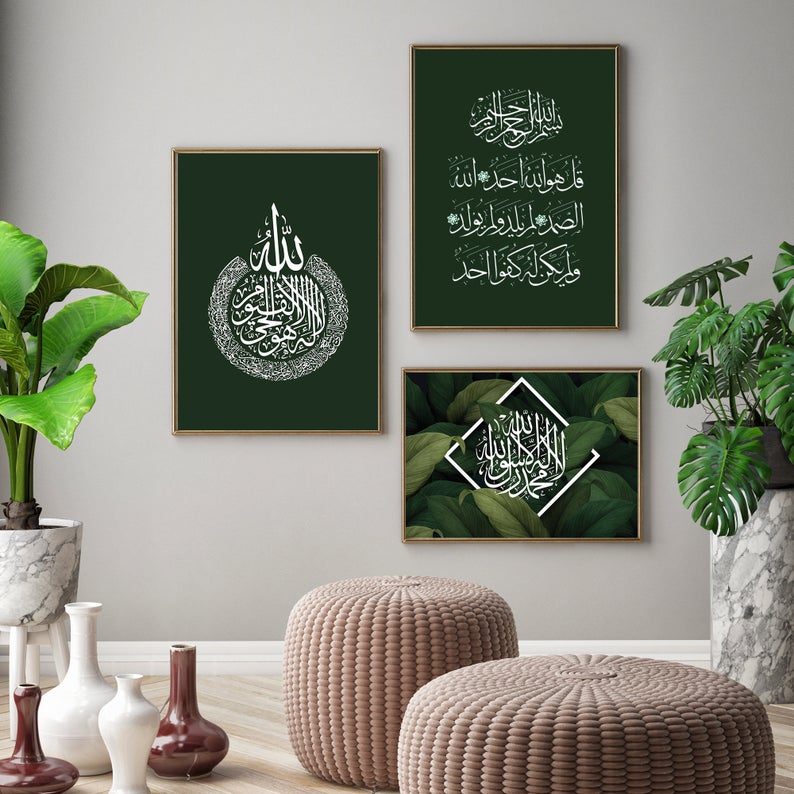 Set of 3 Dark Green Suran Ikhlas ,Shahadha Kalimah & Ayatul Kursi Arabic Calligraphy Islamic Wall Art Prints