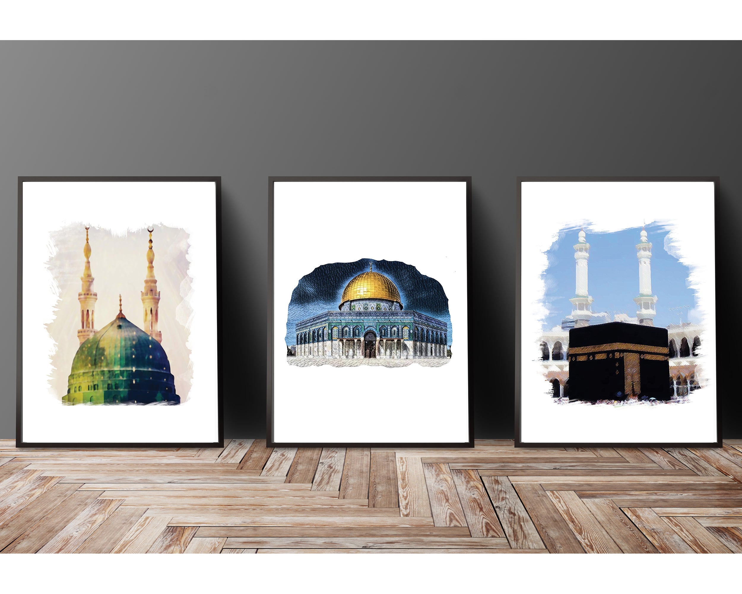 Set of 3 Watercolour Holy Places Masjid al Haram Masjid Nabwi Masjid al Aqsa Kaaba Prophet's Mosque Islamic Wall Art Print Palestine