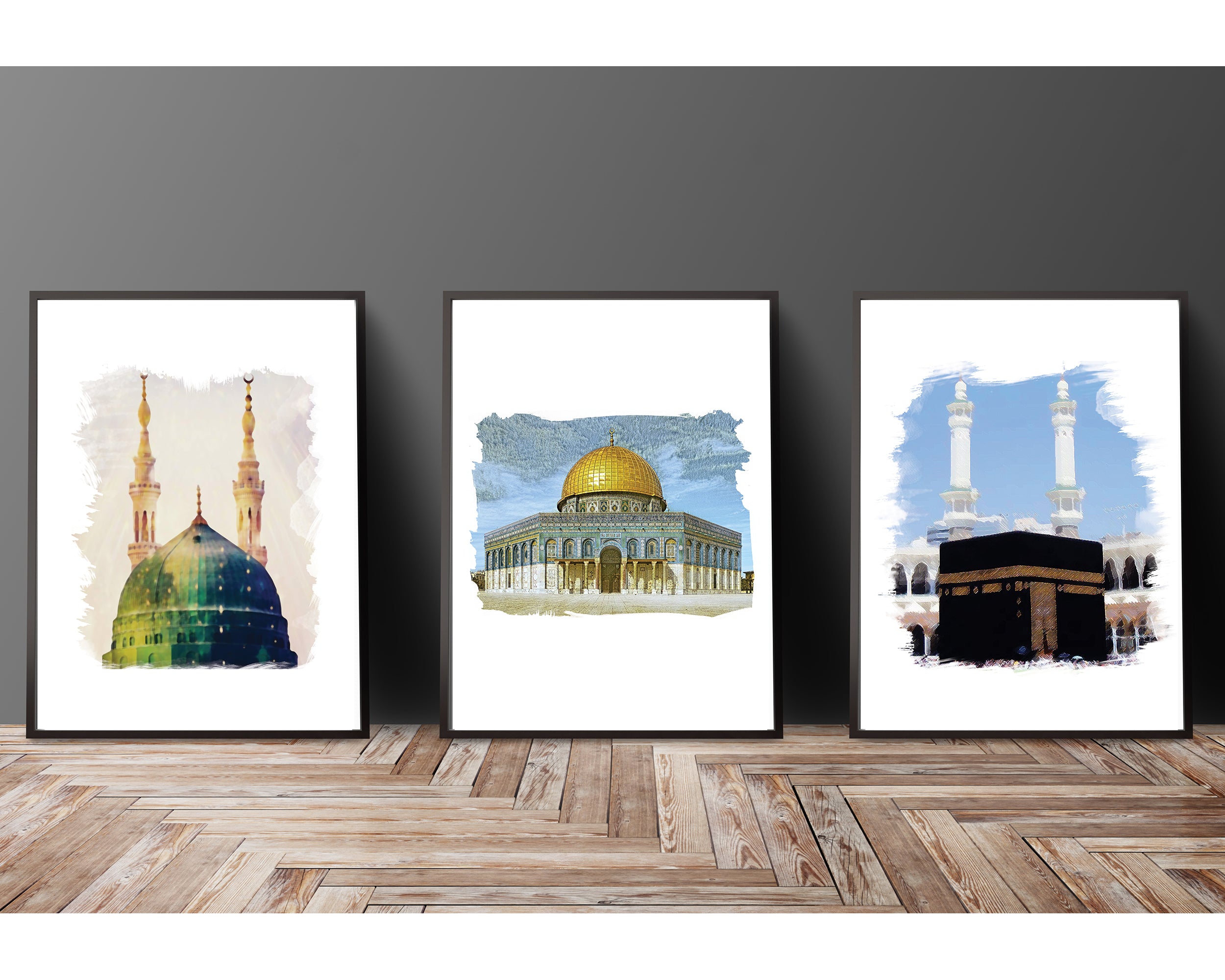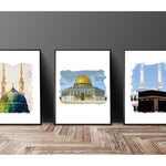 Set of 3 Watercolour Holy Places Masjid al Haram Masjid Nabwi Masjid al Aqsa Kaaba Prophet's Mosque Islamic Wall Art Print Palestine