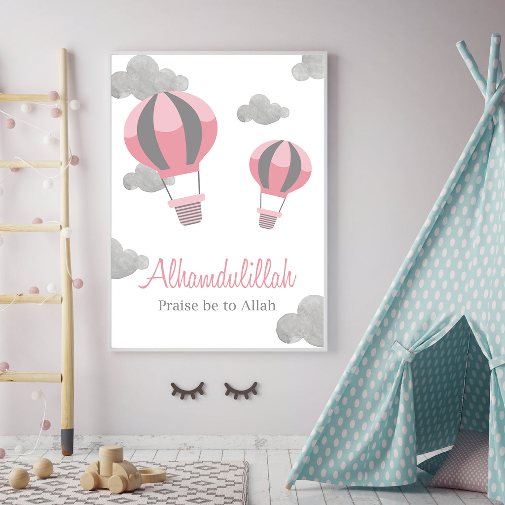 Alhamdulillah Praise To Allah Pink Watercolor Hot Air Balloon Design For Children's Islamic Wall Art Print Kid's Islamic Print Bedroom Nursery Girls Room Children's Islamic Prints