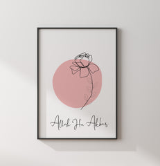 Allah Hu Akbar Blush Pink Floral Botanical Abstract Islamic Wall Art Print With Natural Leafy Tones With English Calligraphy