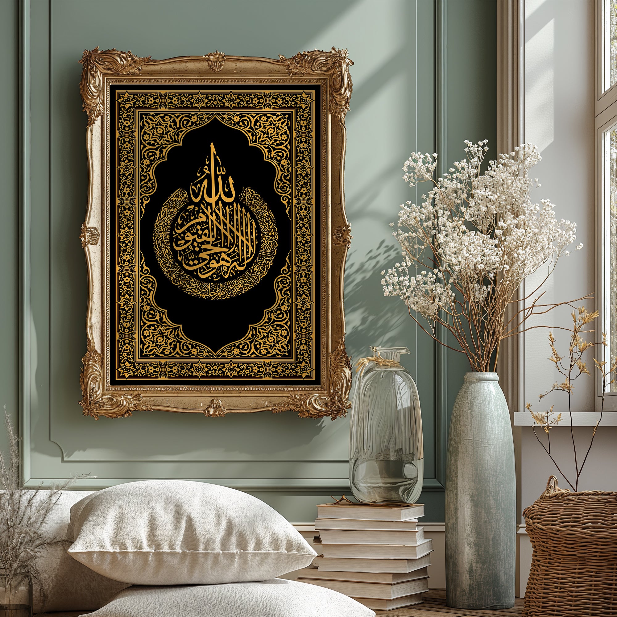 Enhance your space with this stunning Ayatul Kursi Arabic calligraphy wall art, exclusively from Simply Adore. This elegant piece features beautifully detailed golden calligraphy of Ayatul Kursi, surrounded by an intricate decorative pattern that adds an extra layer of sophistication and depth to the design. Set against a bold black background, this art print is perfect for creating a serene and spiritual atmosphere in any room.