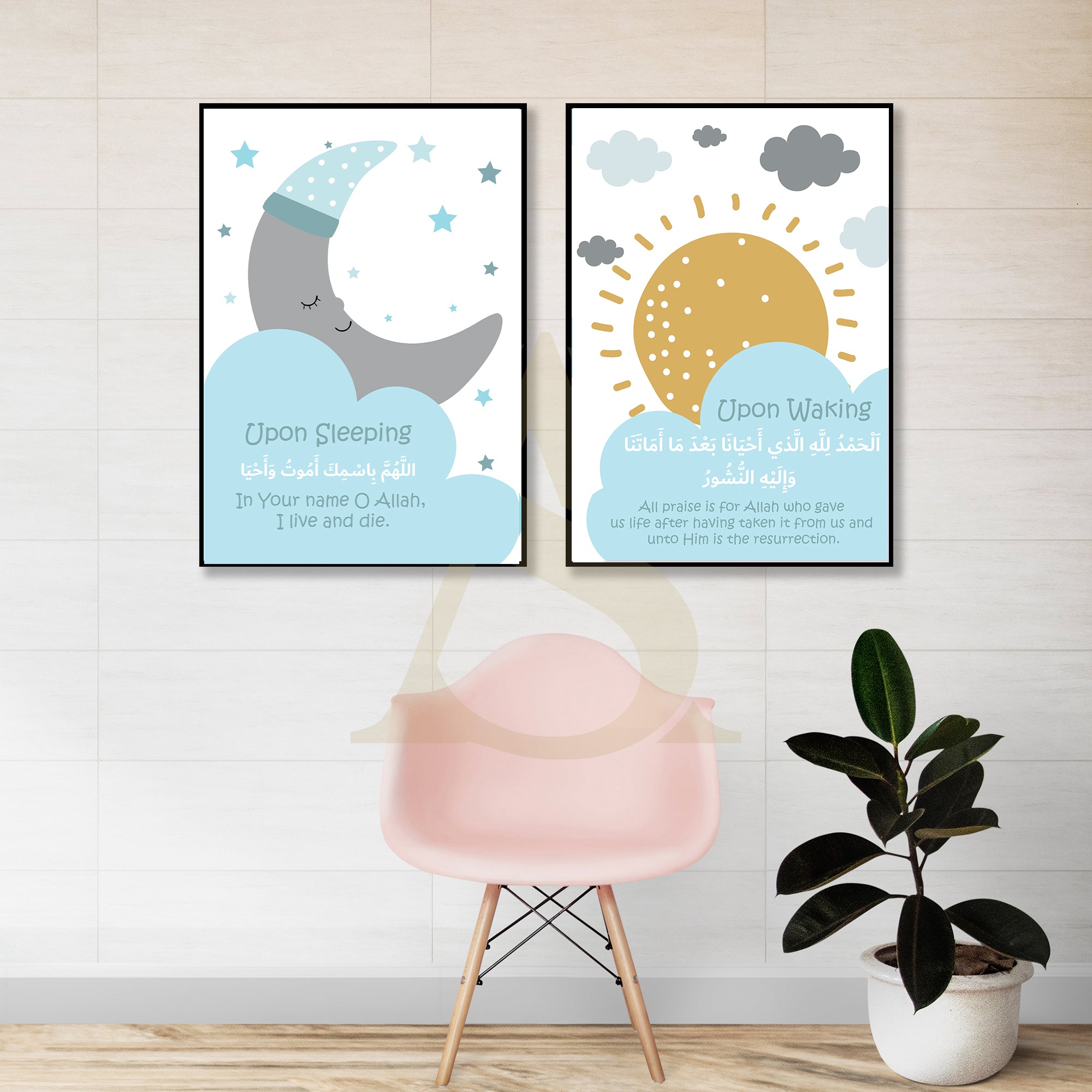 Blue & Grey Set of 2 Morning & Night Dua Arabic & English Calligraphy Islamic Wall Art Prints Kids Islamic Prints House Gift
