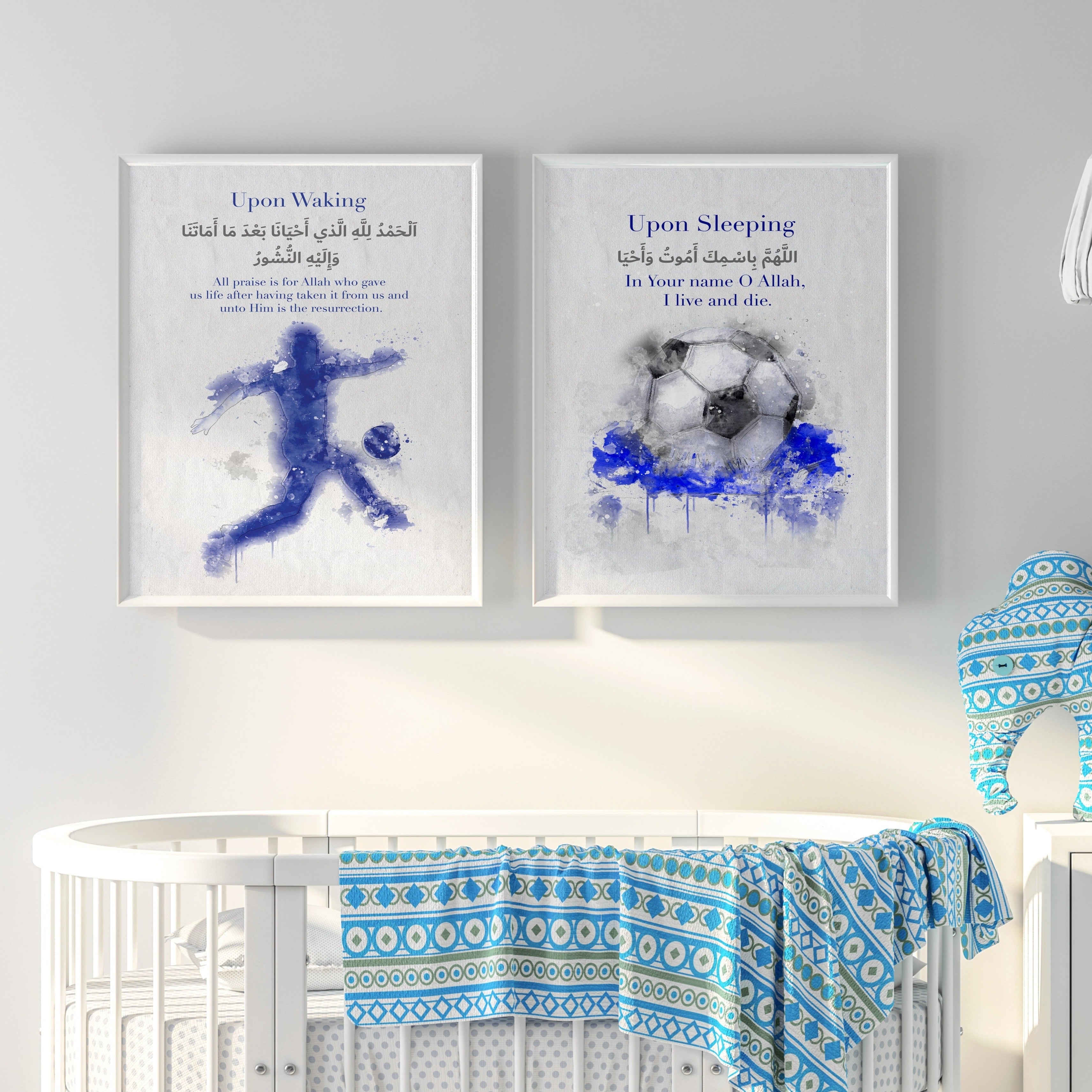 Blue Set of 2 Football Themed Childrens Morning & Night Dua's Upon Waking Sleeping Arabic Calligraphy Islamic Wall Art Print Kids