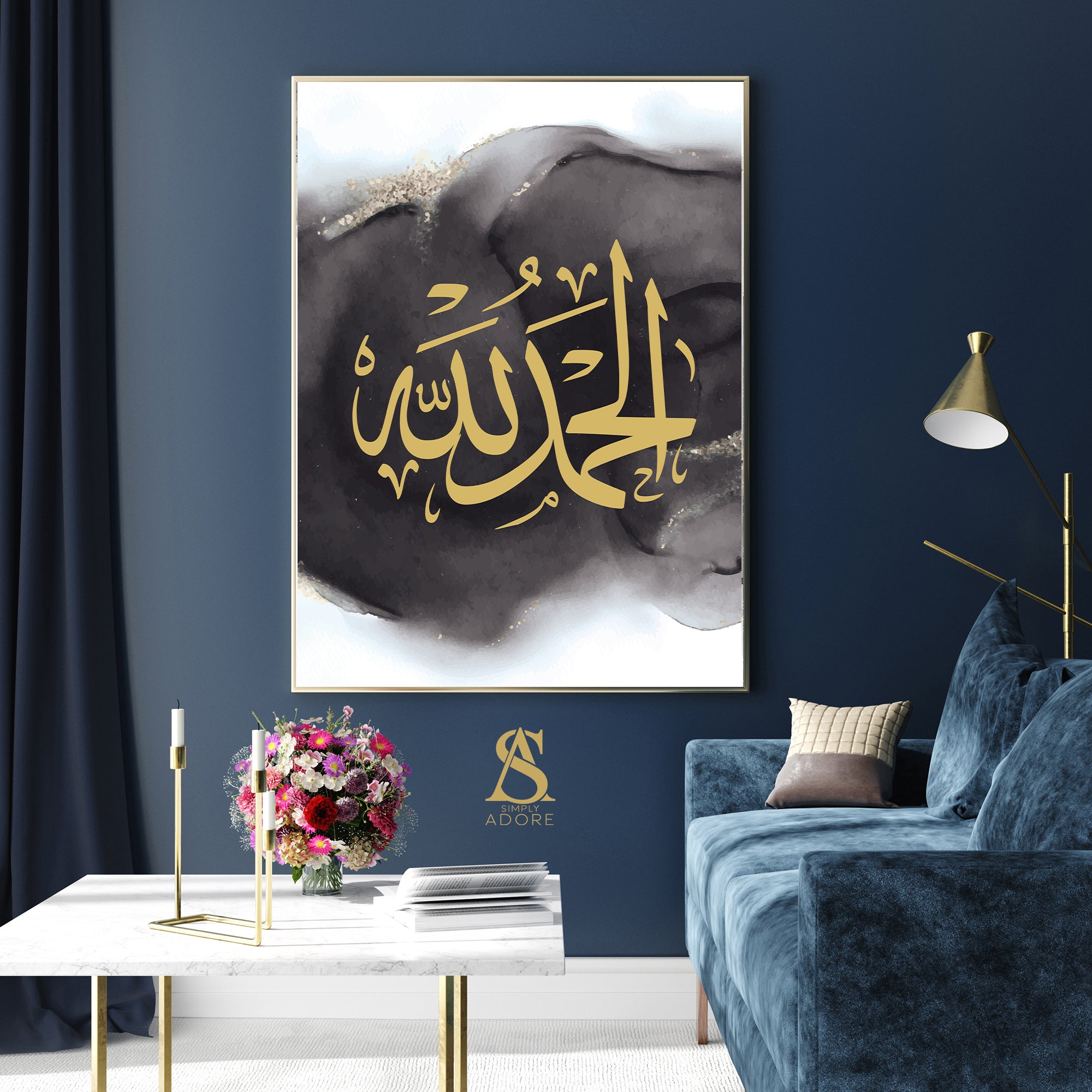 Dark Grey & Gold Watercolor Alhamdulillah Arabic Calligraphy Islamic Wall Art Print Paintbrush Abstract Modern Islamic Print