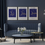 Navy Blue and Gold Abstract Sabr Shukr Tawakkul Set of 3 Islamic Wall Art Prints Vintage Arabic Calligraphy