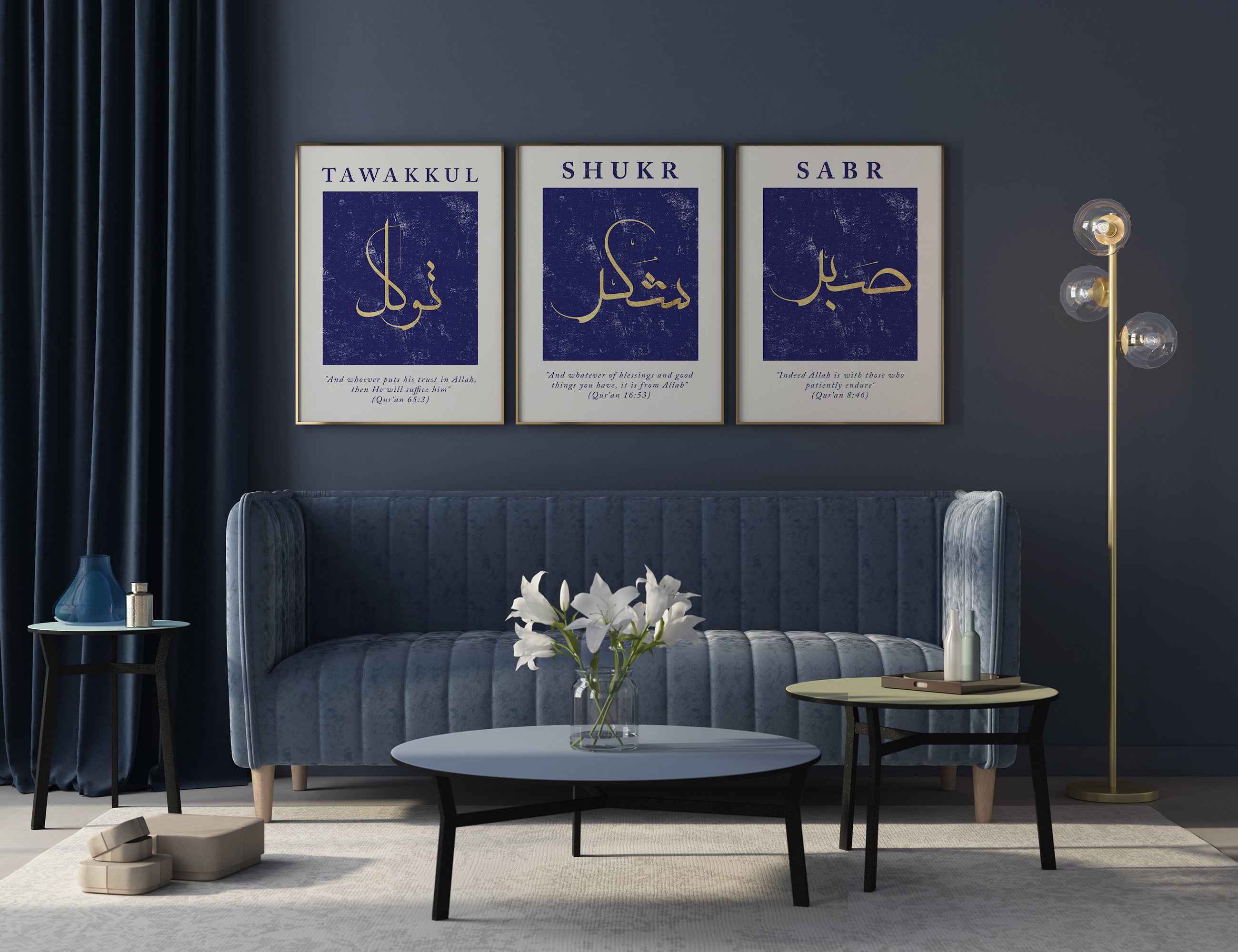 Discover the timeless allure of Islamic wall art with our Sabr, Shukr, Tawakkul Arabic Calligraphy Prints Set, adorned in a captivating navy blue and gold abstract vintage design. Crafted to elevate your space with both aesthetic charm and spiritual depth, each print features intricate Arabic calligraphy of 'Sabr,' 'Shukr,' and 'Tawakkul.'