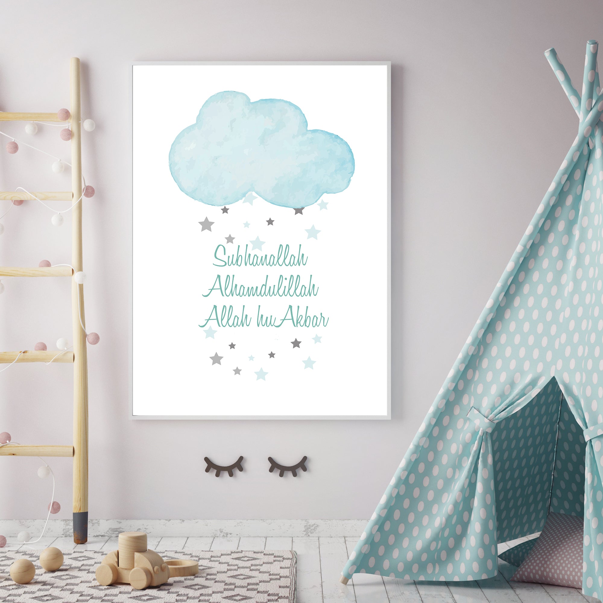 English Tasbi Tasbeeh In A Cloud Design For Children's Islamic Wall Art Print Kids Bedroom Nursery Boys Room
