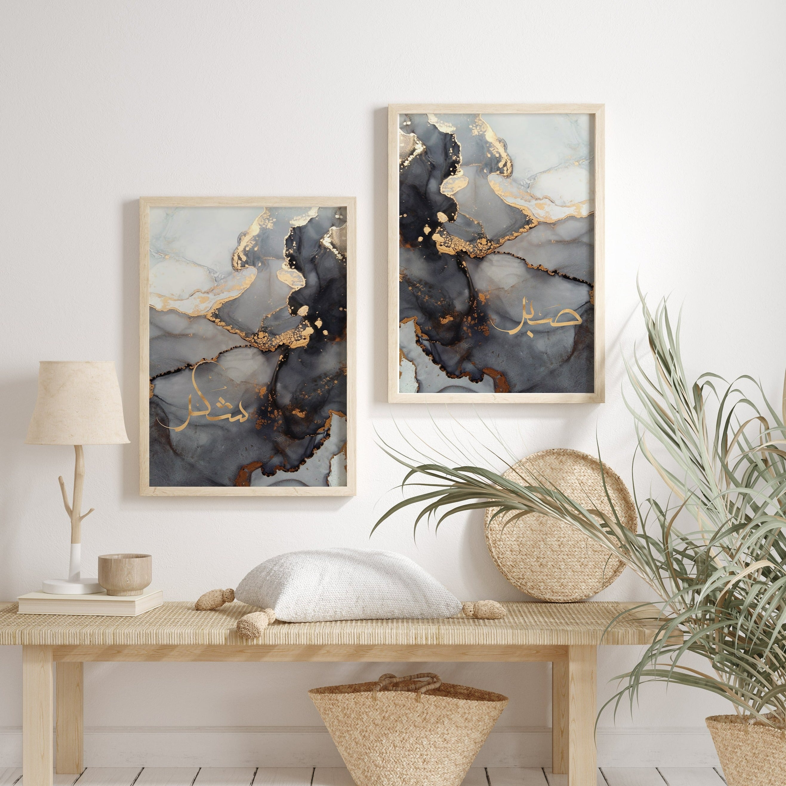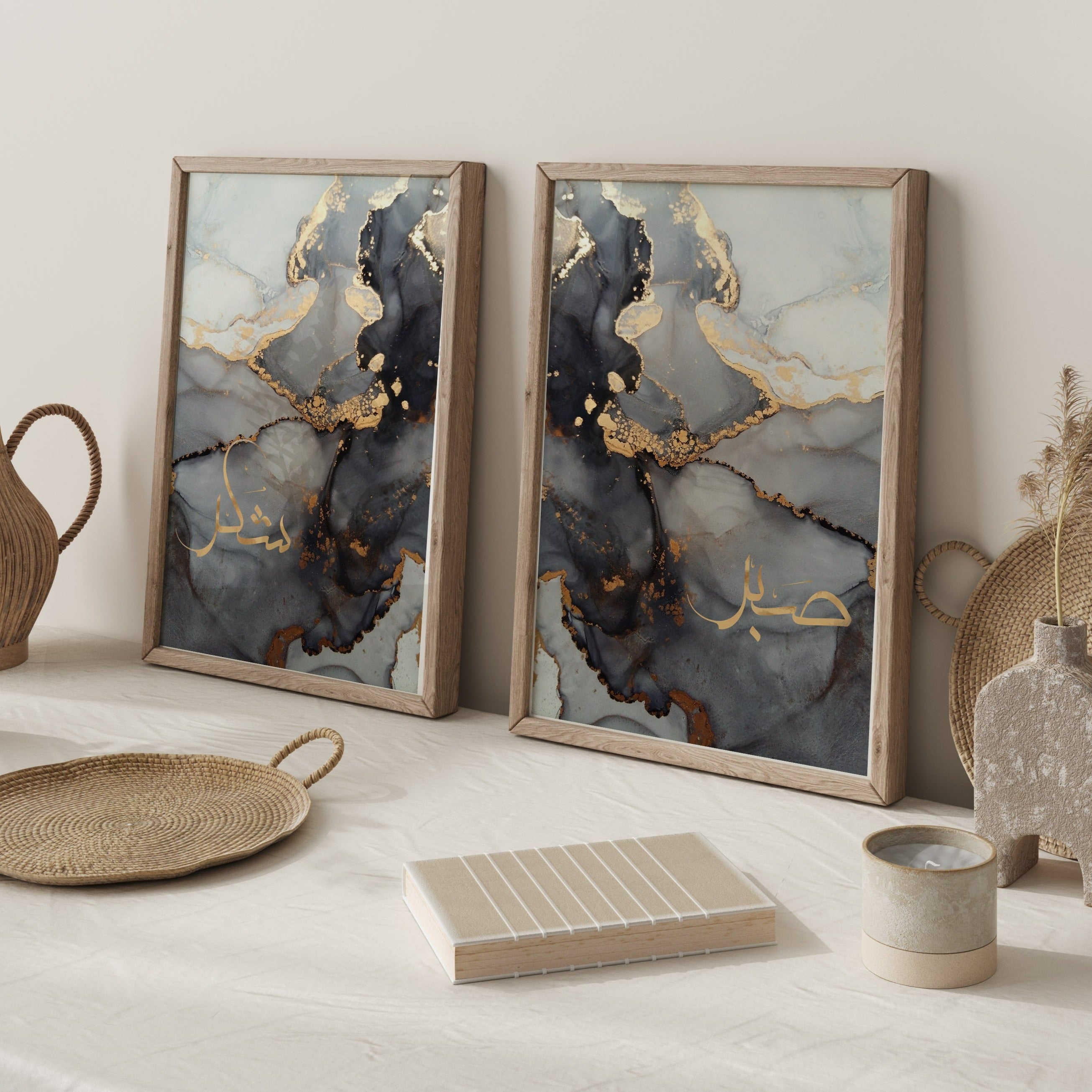Set of 2 Sabr & Shukr Islamic Wall Art Prints | Grey & Gold Alcohol Ink with Arabic Calligraphy