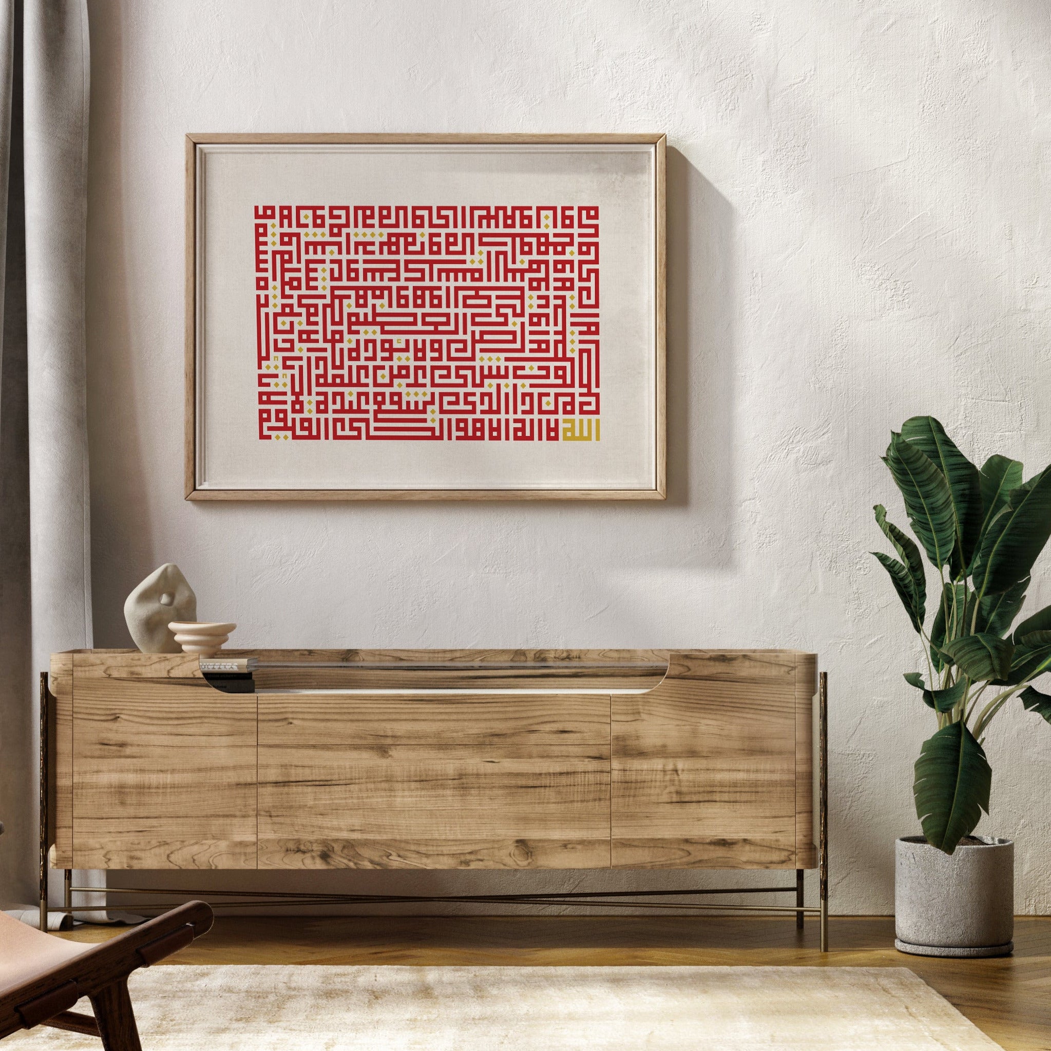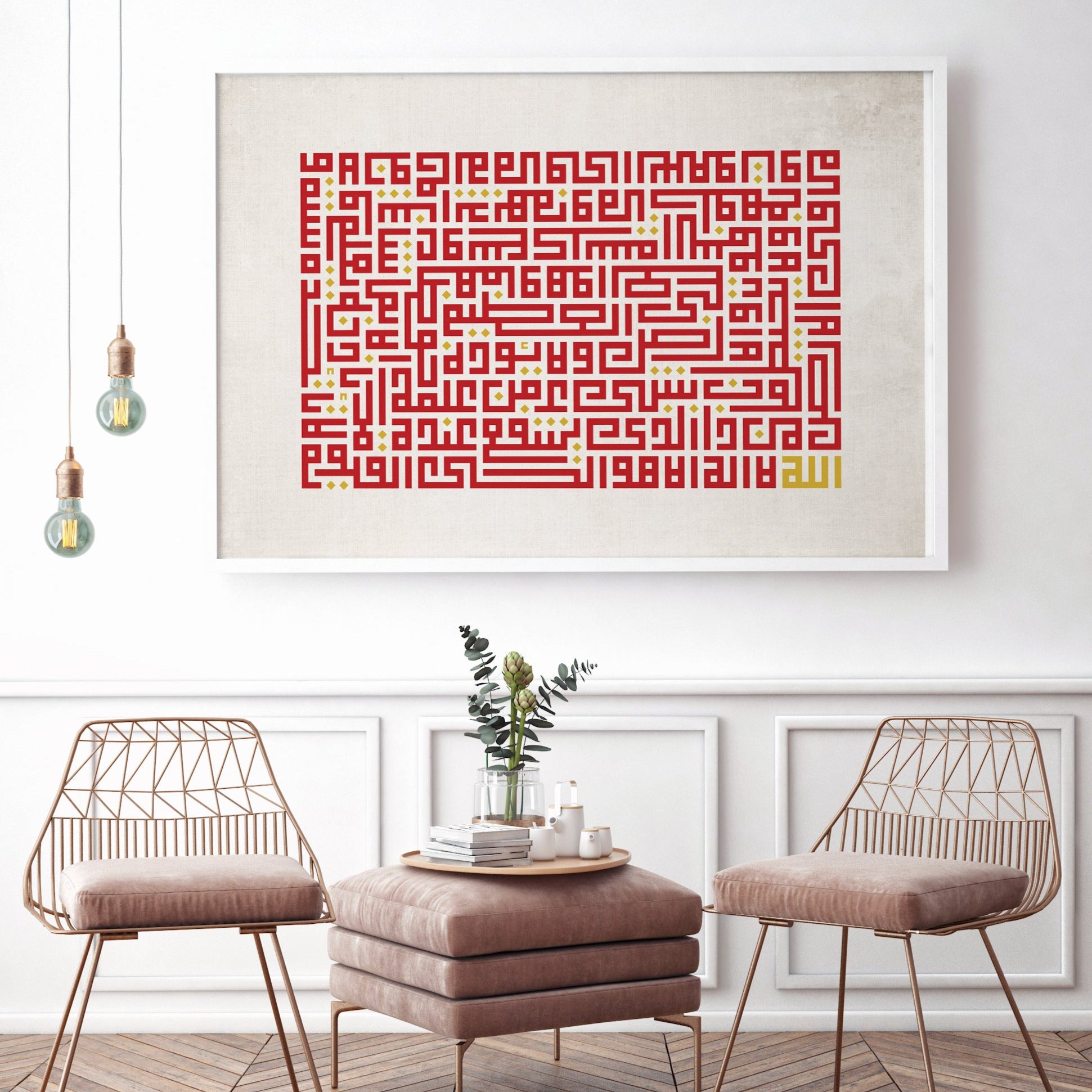 Maroon & Gold Vintage Ayatul Kursi Kufic Arabic Calligraphy Islamic Wall Art Print