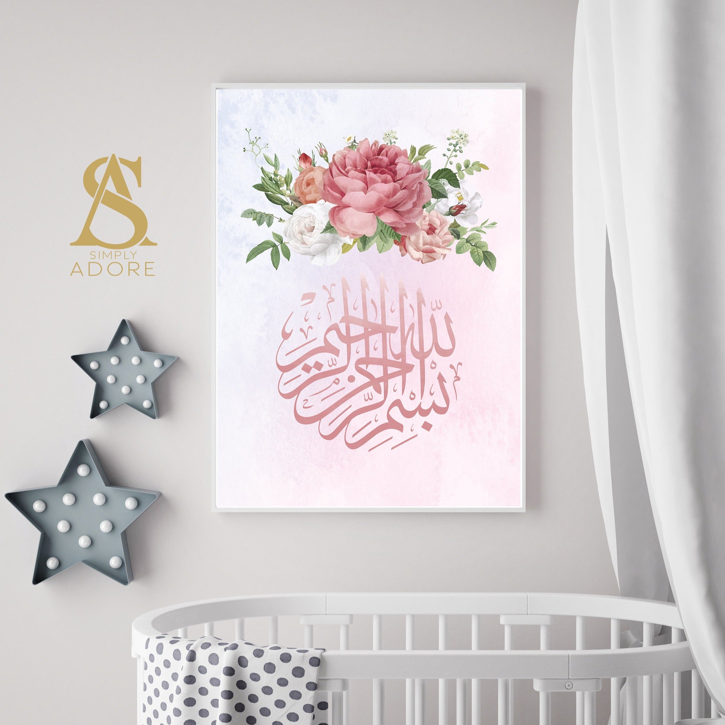 Pink Children's Bimillah Arabic Calligraphy Pink Floral Wreath Watercolour Islamic Wall Art Print Islamic Art Kids Prints