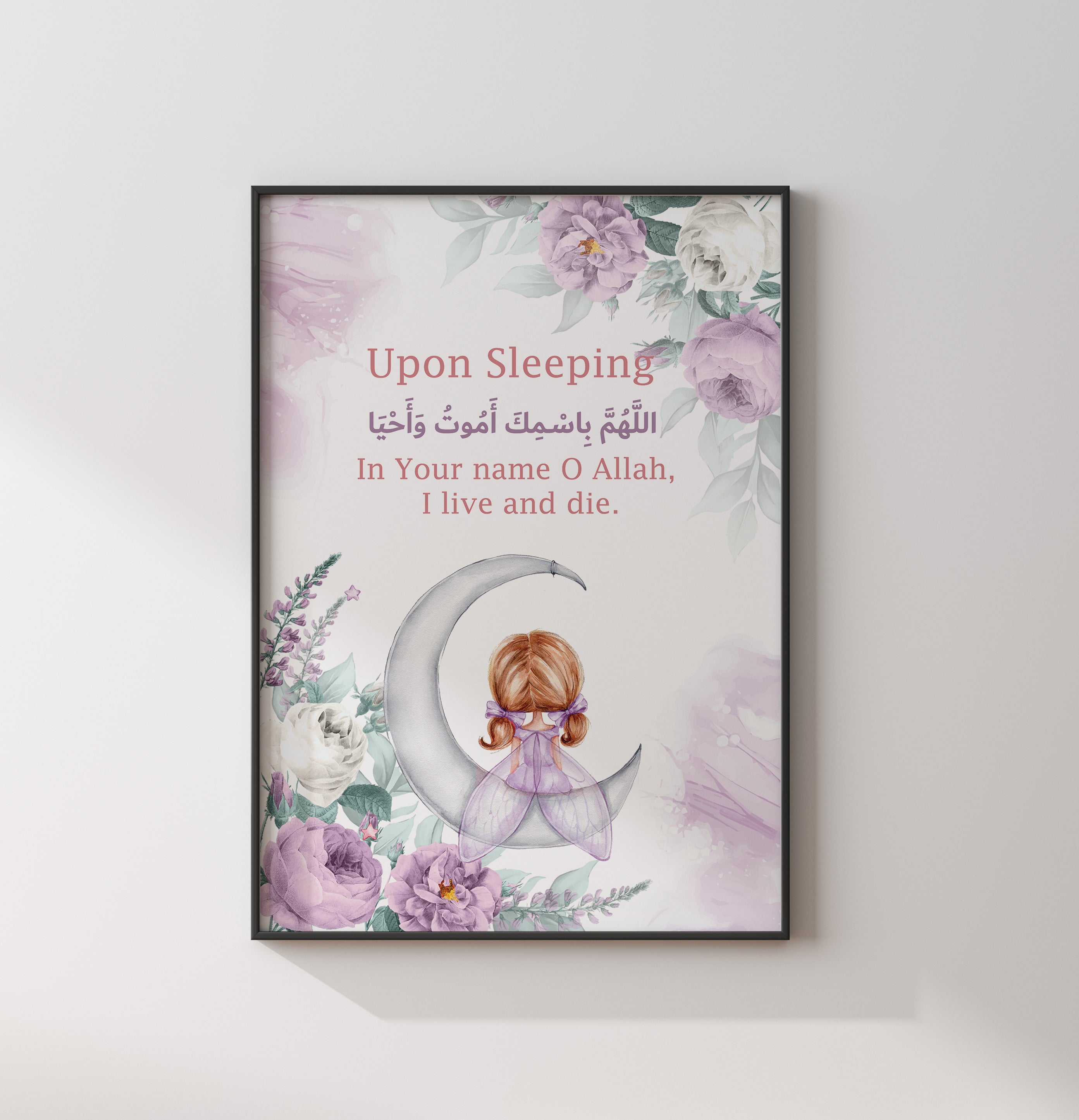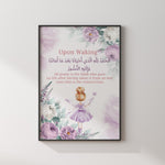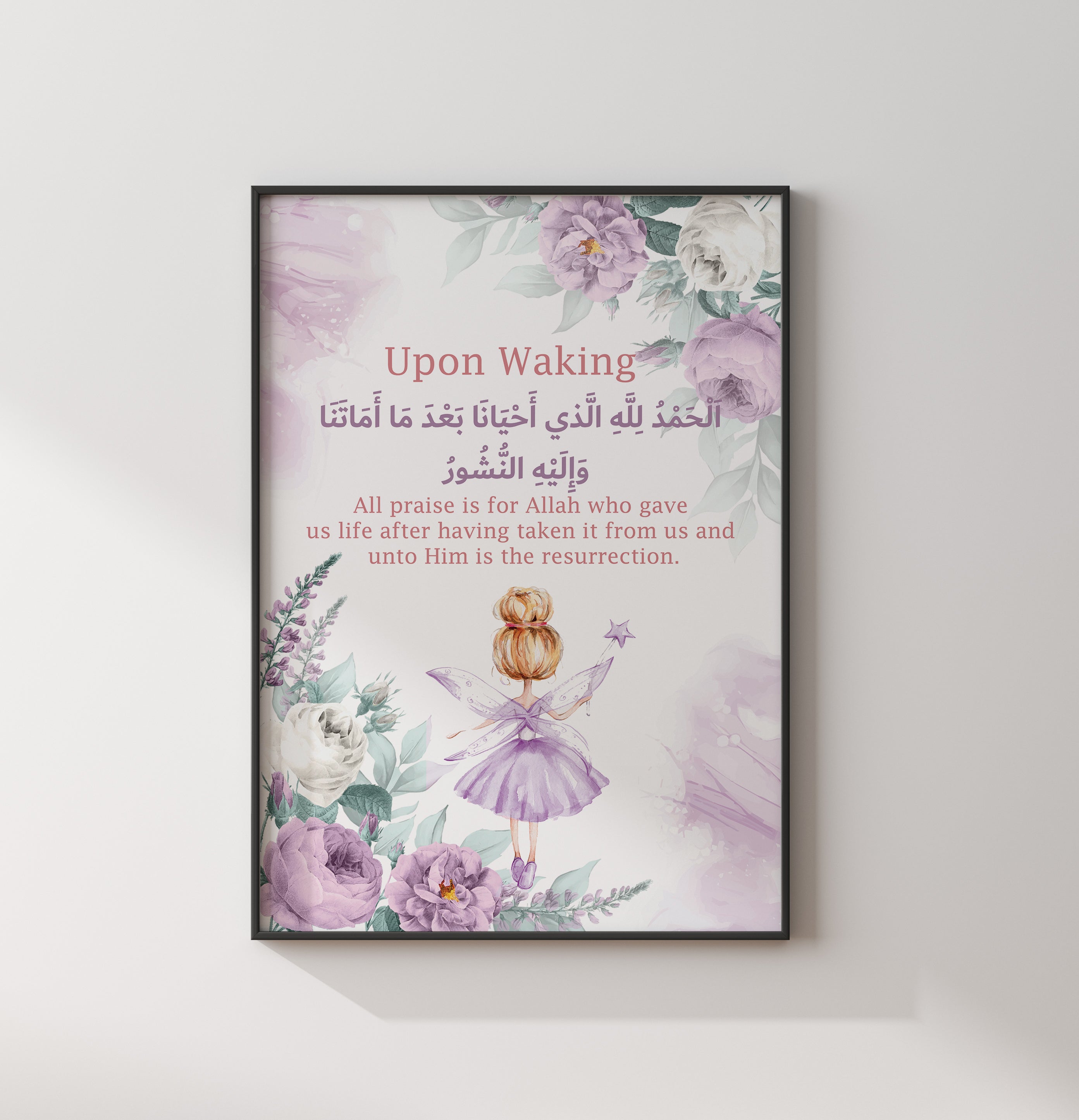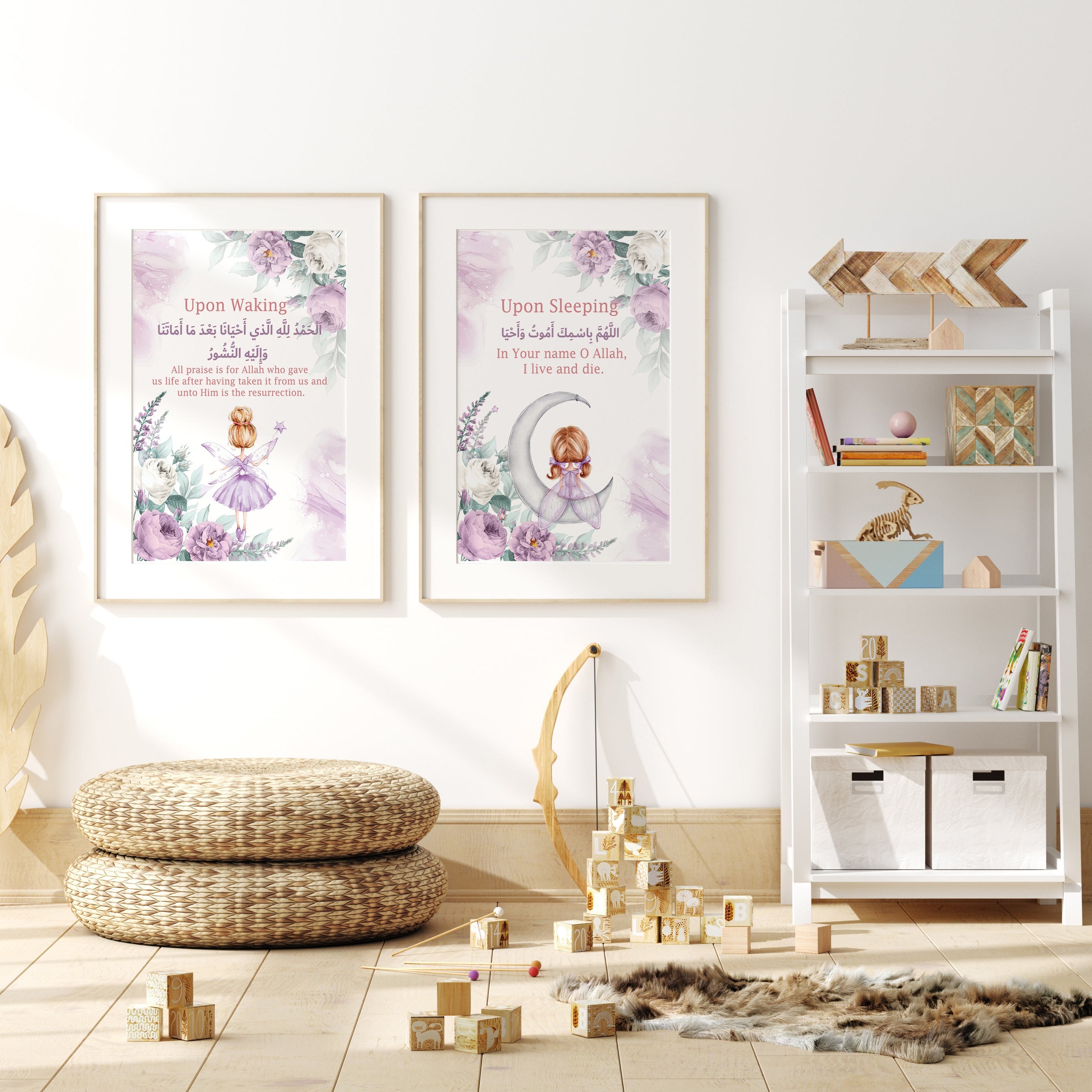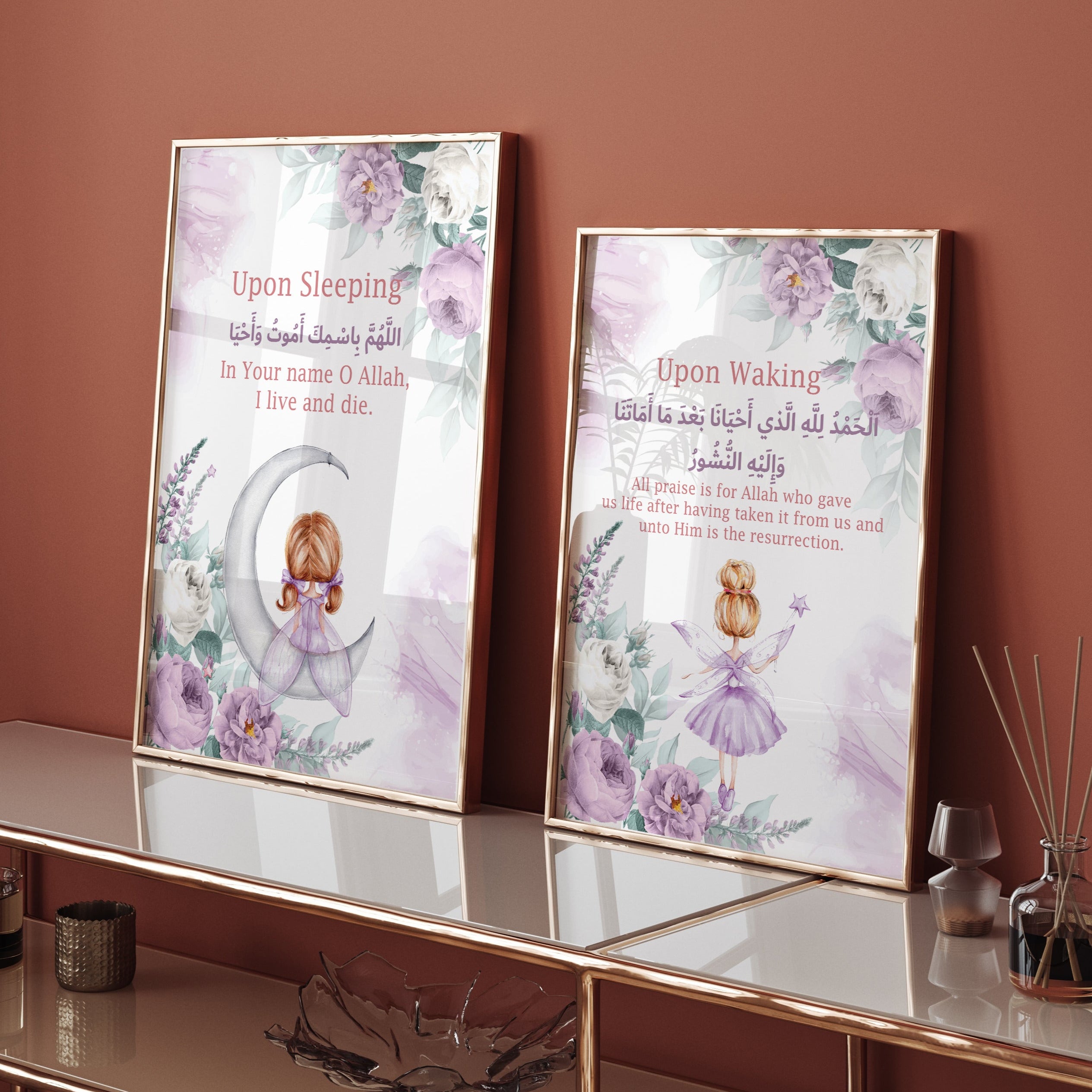 Set of 2 Purple Fairy Themed Childrens Morning & Night Dua's Upon Waking Sleeping Arabic Calligraphy Islamic Wall Art Print Kids