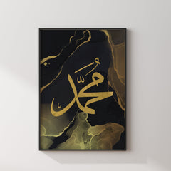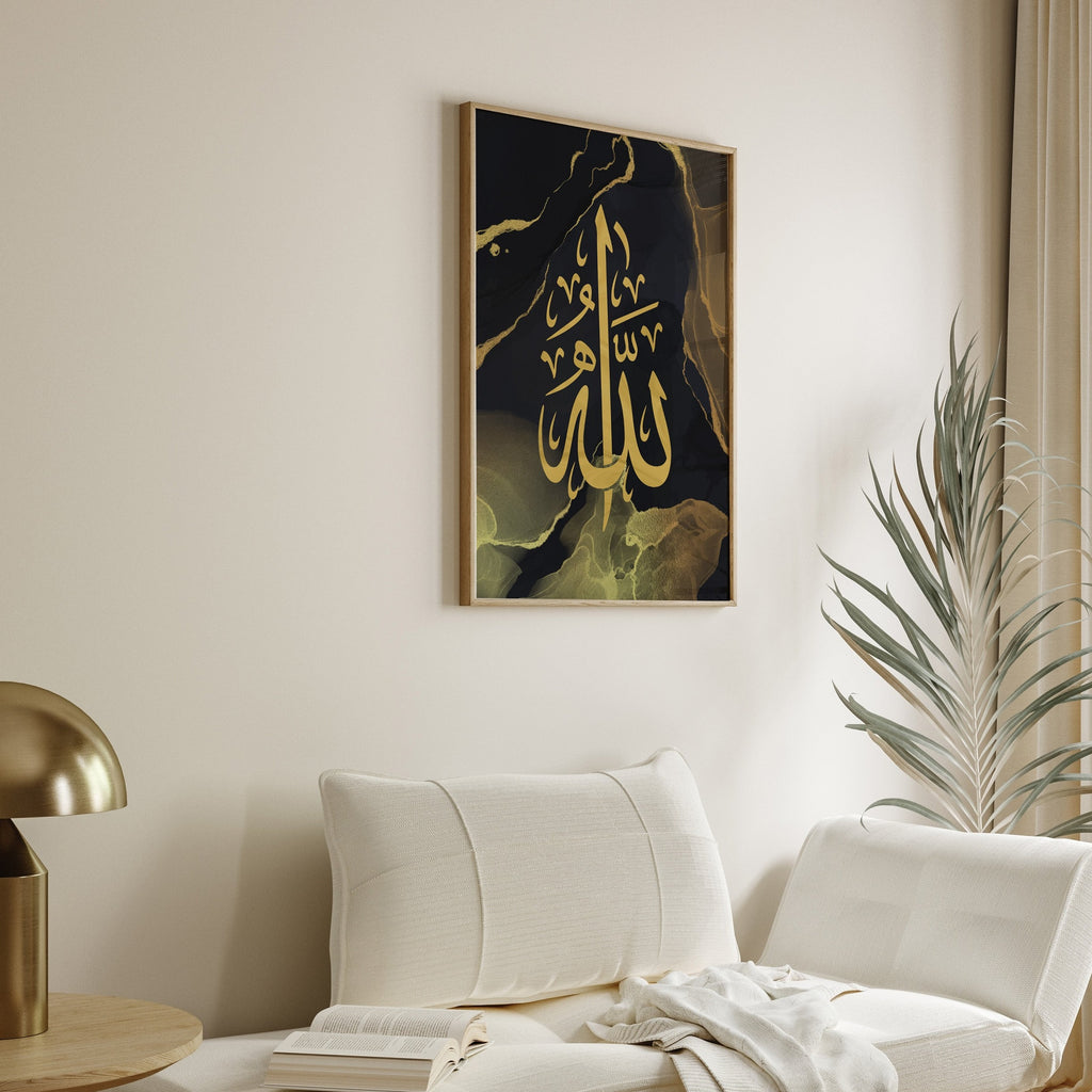 Set of 3 Allah, Prophet Muhammad & Leaves Modern Alcohol Ink Islamic Wall Art Prints With Black & Gold Arabic Calligraphy