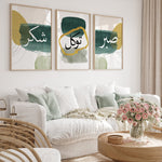 Set of 3 Emerald Green Sabr, Shukr & Tawakul Abstract Arabic Calligraphy Islamic Wall Art Prints