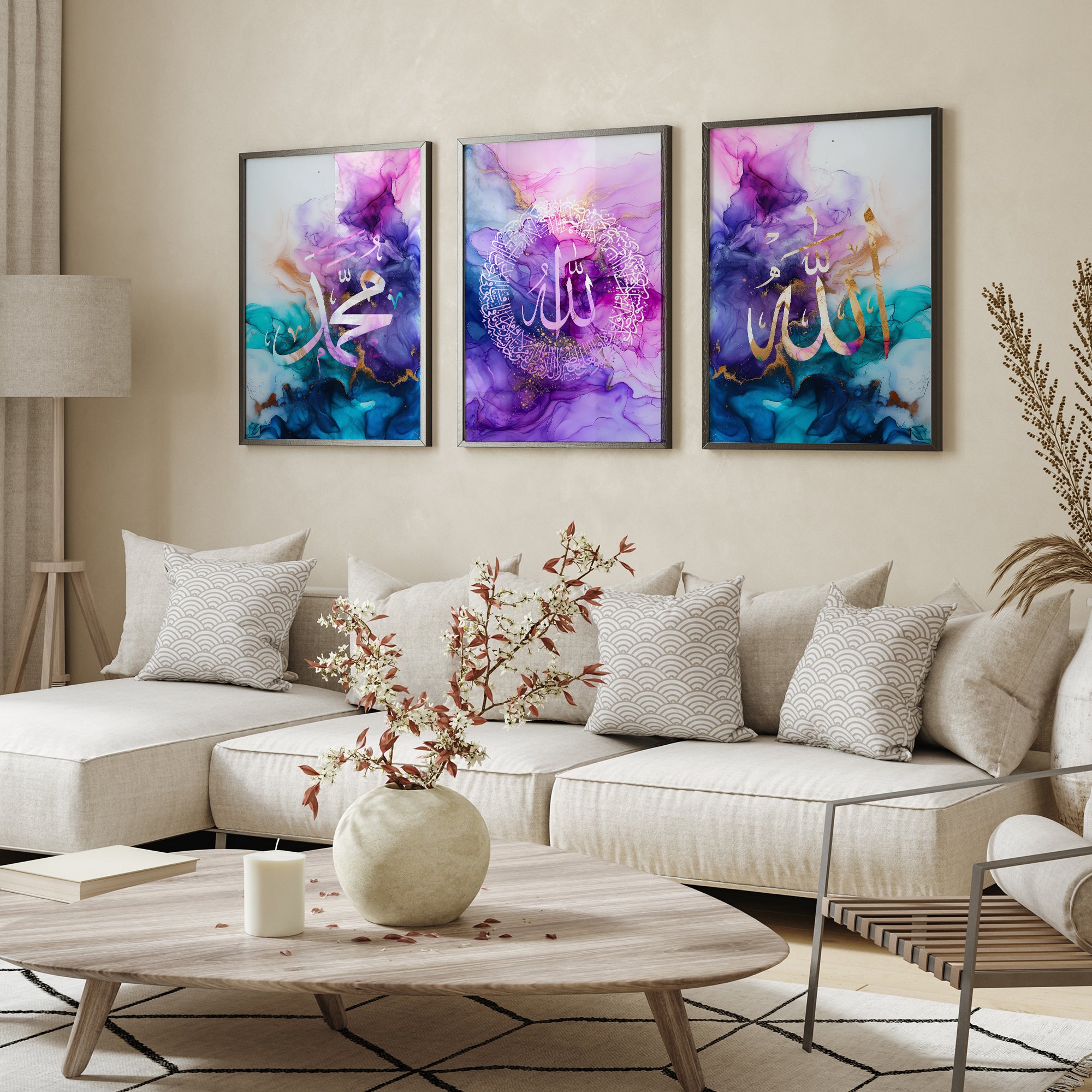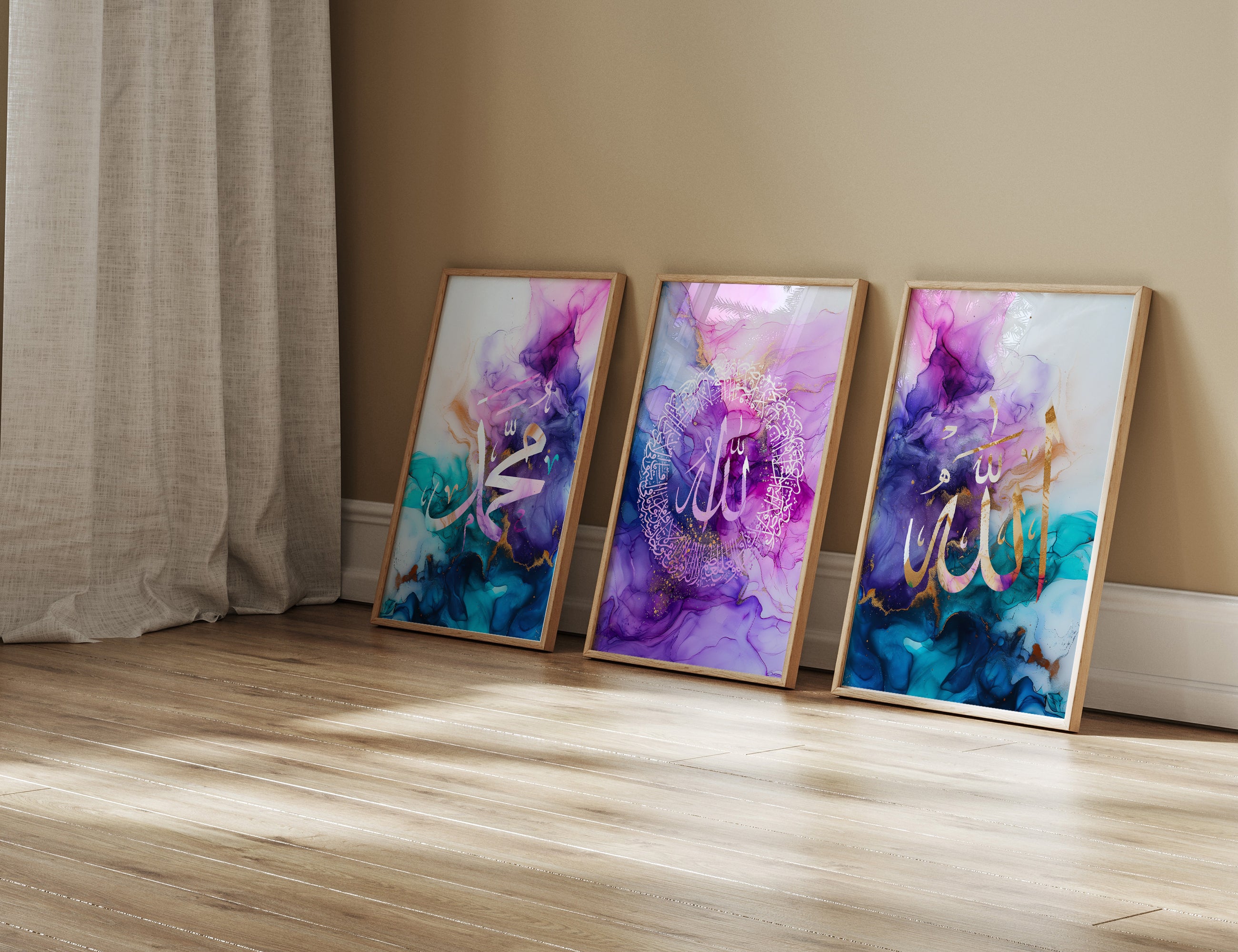 Set of 3 Islamic Wall Art Prints, each adorned with profound significance and adorned in a mesmerizing purple, teal, and blue alcohol ink painting design.