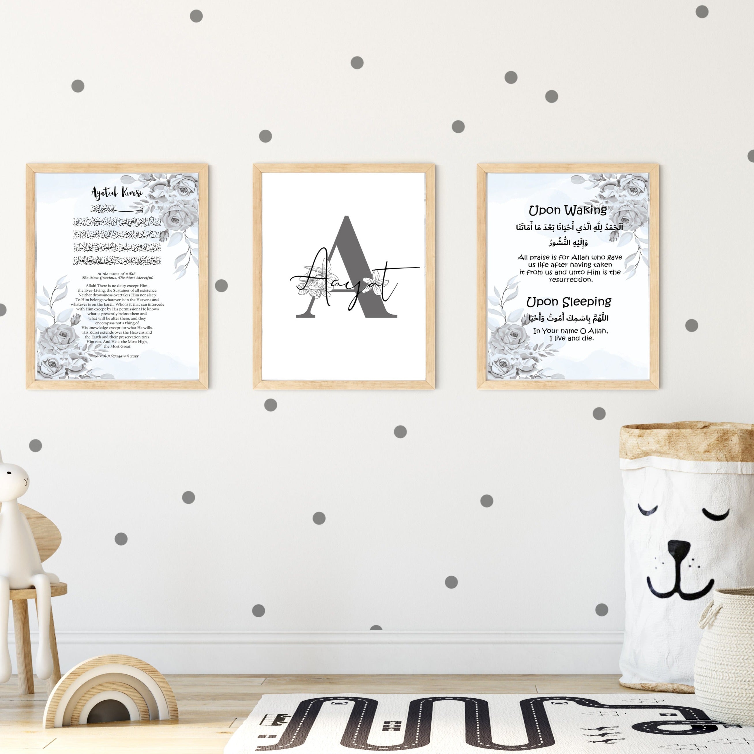 Set of 3 Personalised Morning/ Sleeping Dua Ayatul Kursi Children's Islamic Wall Art Print Kids Nursery Grey & Black